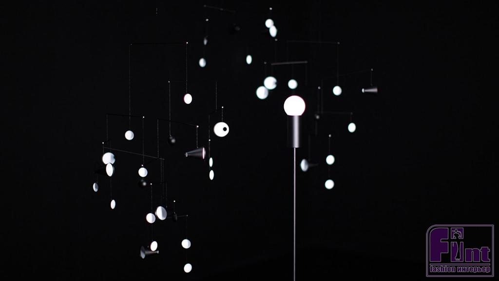 Медитативный мобиль-светильник придумала японка Хирото Йосидзое. Объект под названием «1.625m/s2» состоит из одиночной лампочки и множества круглых зеркал, которые подвешены вокруг неё. По словам автора, она вдохновлялась тем, как свет солнца отражается от поверхности луны, и хотела передать красоту ночного неба.