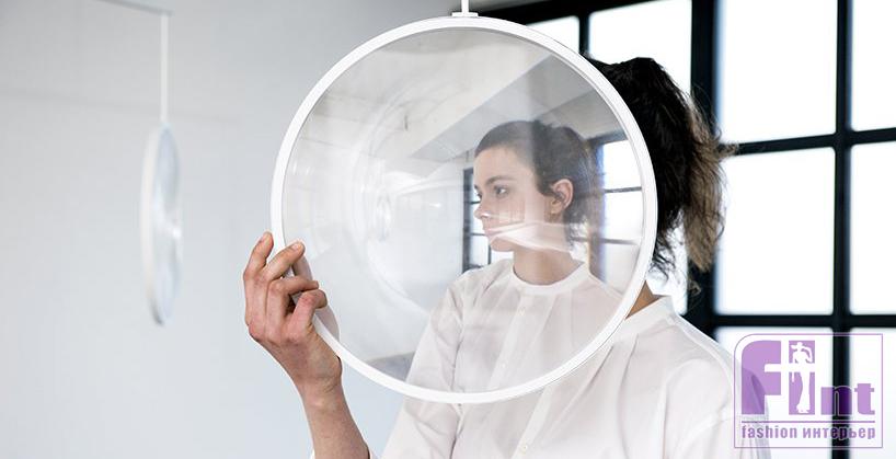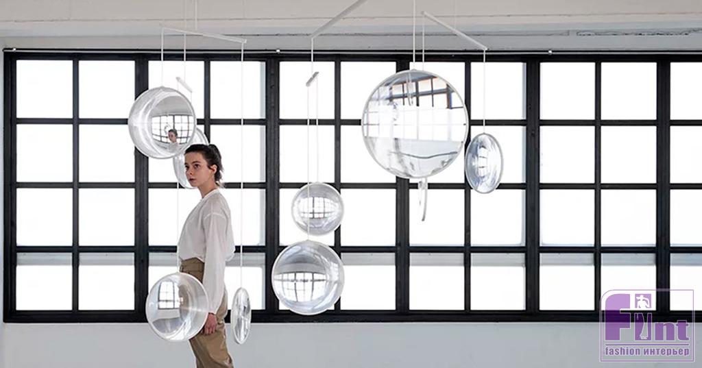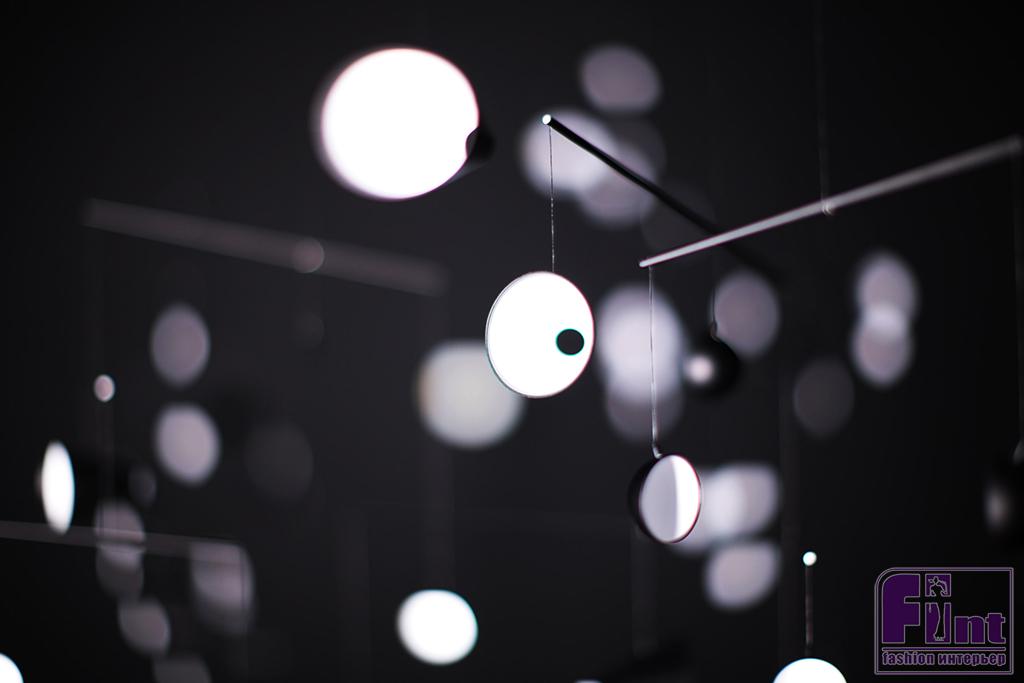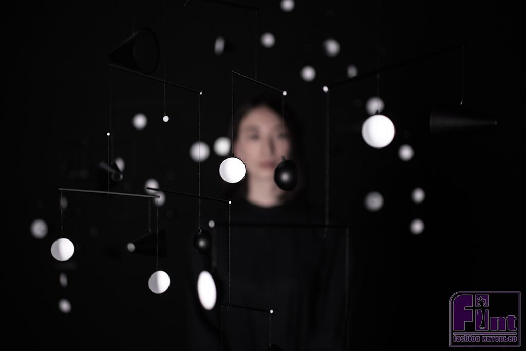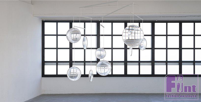 Еще один мобиль спроектировал дизайнер Юдзи Окицу. Он тоже «работает» со светом и тоже сделан из круглых элементов, только здесь это прозрачные крупные линзы, которые преломляют лучи света и искажают пространство.
