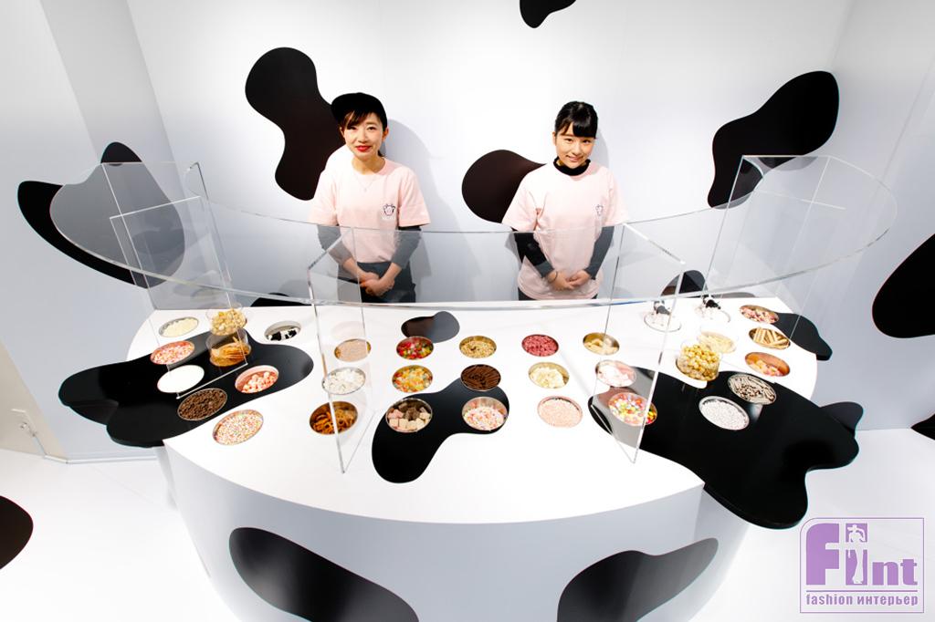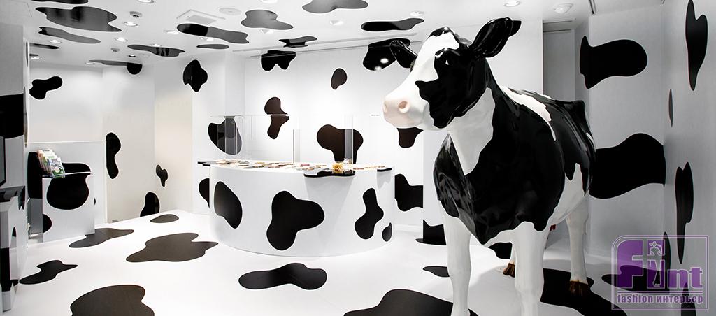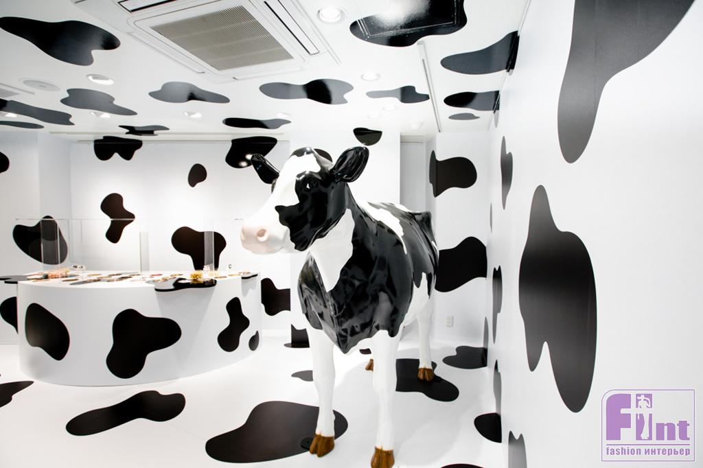 Другой проект из Японии — забавный чёрно-белый магазин молочных продуктов Milk Land, интерьер которого создан архитектором Рюсуке Нанки по мотивам бара Korova из книги (и фильма) «Заводной апельсин». Пространство, созданное Нанки, временное, так что архитектор решил не мелочиться и покрыл пол, стены, потолок и мебель чёрно-белым «коровьим» узором.