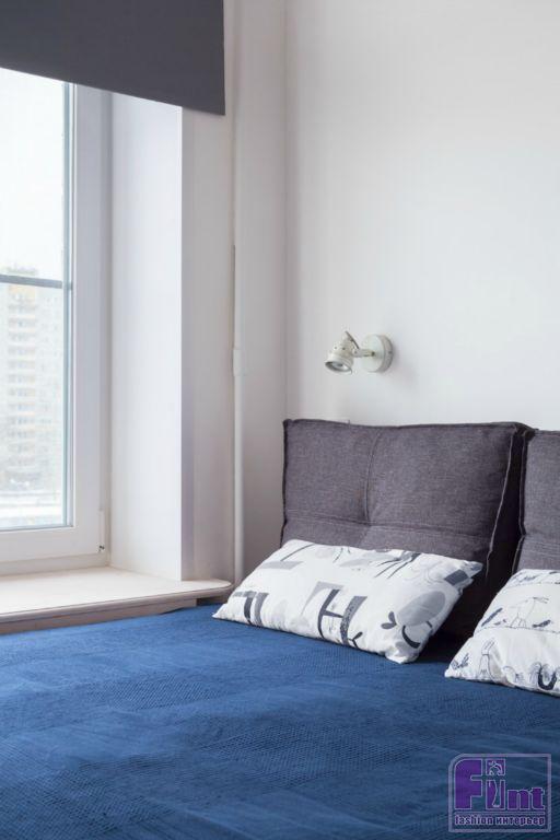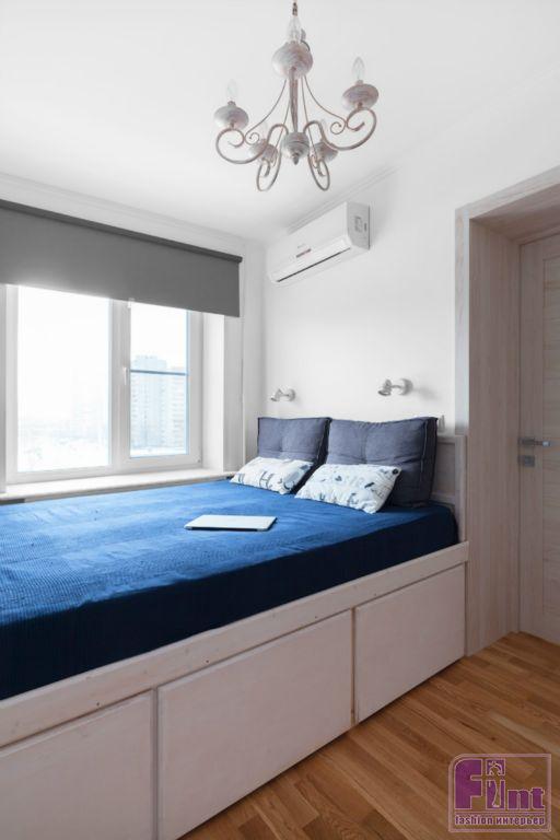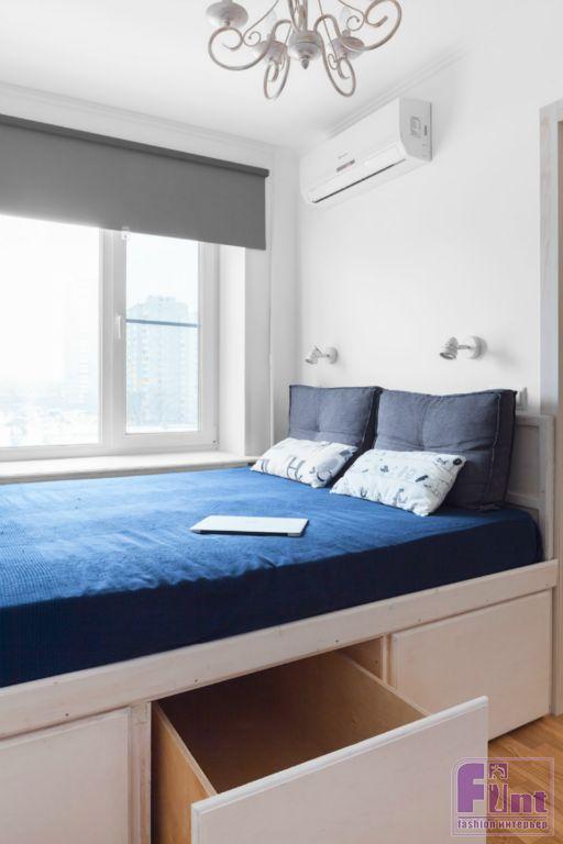 Несущая стена отделяла очень узкую комнату 210 см шириной. Перенести дверной проём или вовсе изменить планировку оказалось невозможным. Поэтому вместо привычной кровати установили подиум, сделанный на заказ. В подиум, по замыслу дизайнера, были вмонтированы вместительные выдвижные ящики, дополнившие гардеробные системы хранения.