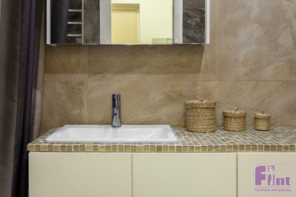 Стиральная машина в санузле спрятана под поверхность, чтобы не портить внешний вид и освободить дополнительное место. Вообще, битва за пространство была основным сюжетом этого проекта. Притом, что площадь «театра военных действий» составляла всего 45 квадратных метров!