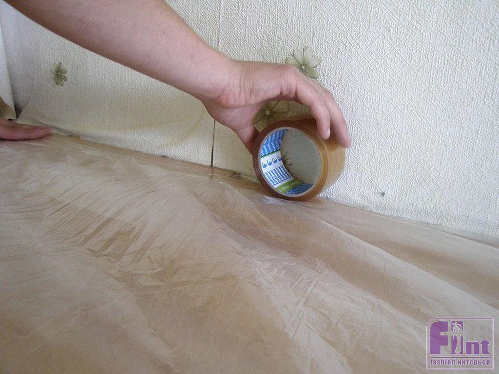Прежде чем вы начнете снимать старые обои, важно защитить другие поверхности в комнате от воды и грязи, которые непременно будут сопутствовать процессу удаления обоев. Обязательно используйте полиэтиленовую плёнку и малярную ленту, чтобы полностью покрыть дорогие поверхности. Особенно тщательно следует защитить полы, также покрыв их плотной полиэтиленовой плёнкой, крепко приклеенной малярной лентой к плинтусу или к месту стыка пола и стены.