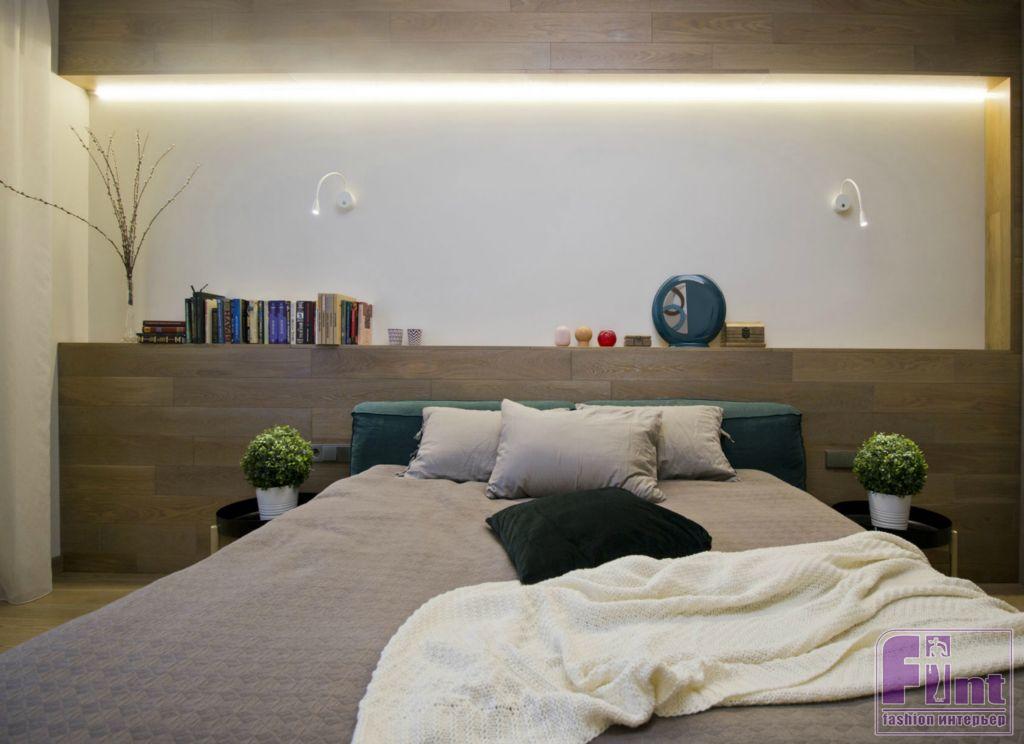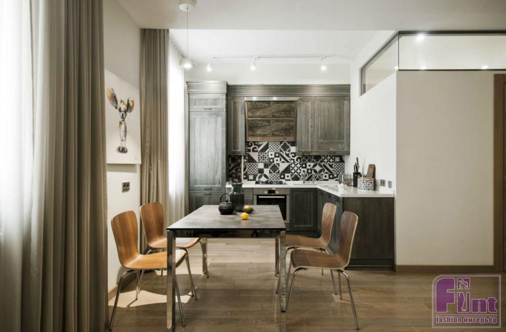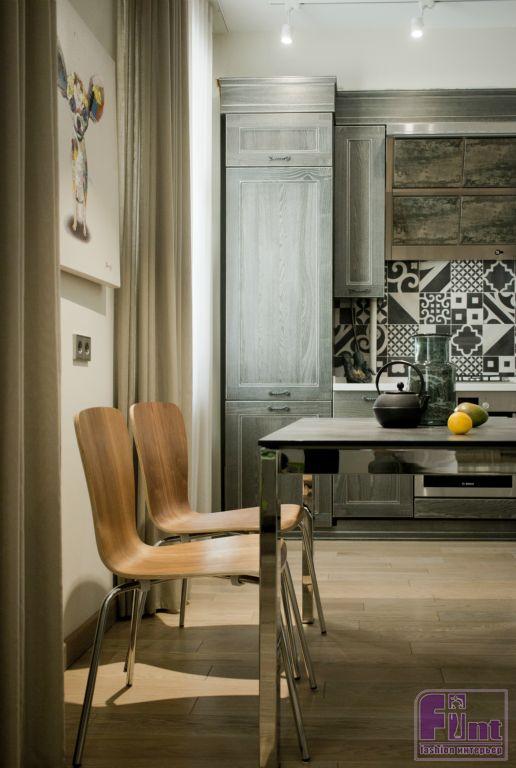 В целом, зонирование получилось продуманным и логичным: большая гостиная с кухней и столовой зоной, две спальни, объединенный санузел и просторная зона прихожей. Стилистически квартира представляет собой современный микс из разных направлений. Так, от минимализма взяты световые схемы и функциональная мебель, из этно — сложные фактуры для декорирования, из экостиля — использование таких натуральных материалов, как камень и дерево, а из лофта — грубые и темные поверхности кухонного гарнитура.