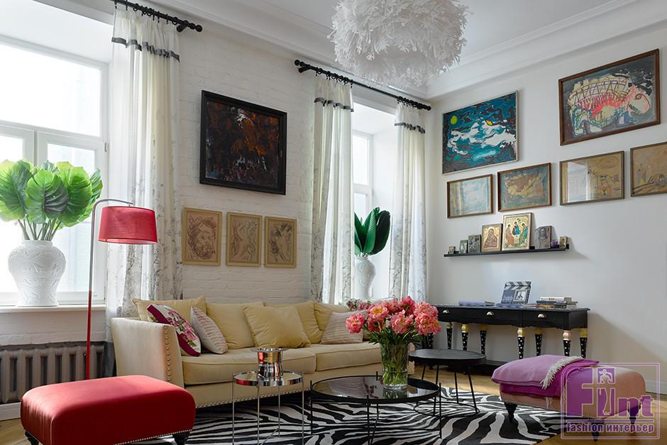Последний штрих — развеска картин. Сказать, что их много, — ничего не сказать. мне пришлось разместить более девяноста произведений — шпалерной развеской, чтобы поместились. Их собирает мама Валерии, дарят друзья, да и сама Валерия — очень самобытный художник. Мы развешивали картины три дня, не покладая дрели. Редкий случай полного единодушия заказчика и декоратора!»