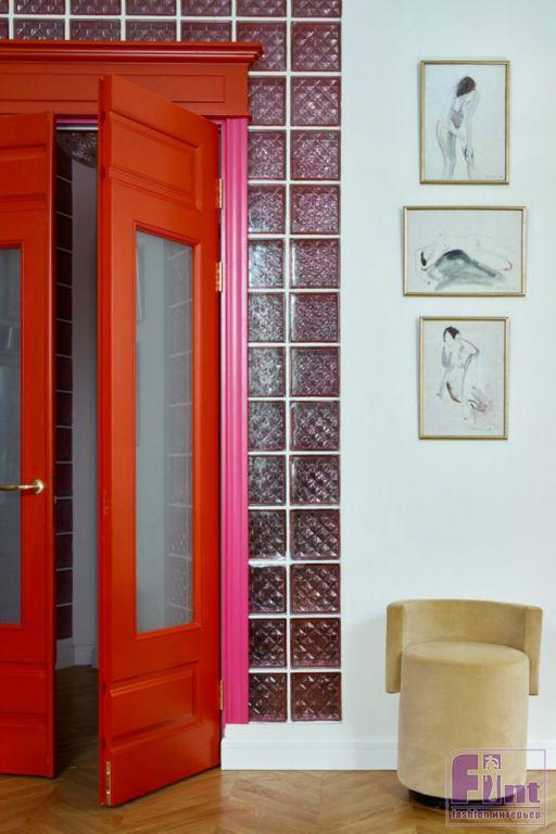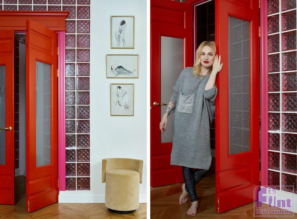 Валерия легко принимает решения, даже хулиганские — как настоящий режиссер, она мыслит образами. Так появились красные двери с наличниками цвета фуксии и розовые прозрачные стеклоблоки в ванной. Я просто оправила фото с фешн-показов, где модели шли по белому подиуму в красно-розовых одеждах, и решение было принято. Согласитесь, не каждый согласится на красные двери. Зато какой эффект!