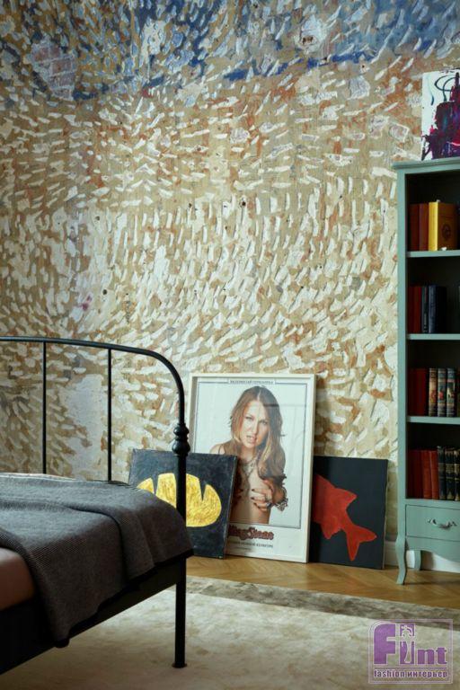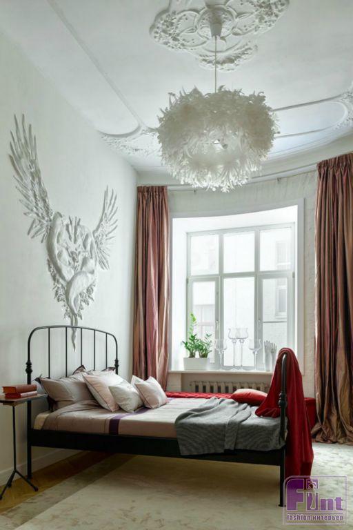 Когда бригада сбила старую отделку, я увидела живописные следы газет и обоев разного времени. Так мы и оставили, закрепив все с помощью пропитки, чтобы не осыпалось. Барельеф над изголовьем я придумала под впечатлением лепнины, которую я когда-то увидела в шоу-руме Александра Маккуина, а похожий эскиз тату давно хранился в моём телефоне. Образ трансформировался в двух лисичек с букетом репейника — под стать гламурному панку Германики. Реализовала барельеф художник-мультипликатор Аля Трофимова.