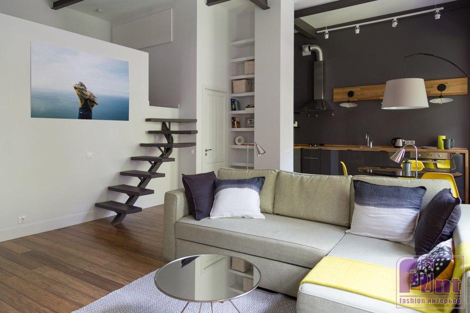 Чтобы не загружать пространство, также решили отказаться от всех шкафов, даже на кухне. Гардеробную оборудовали под мезонином, а кухонные принадлежности спрятали за фасадами под столешницей. Со стилем определились практически сразу — лофт. Однако кирпич, спрятанная в тёмных оттенках кухня и лестница на второй ярус здесь уравновешиваются светлыми стенами.