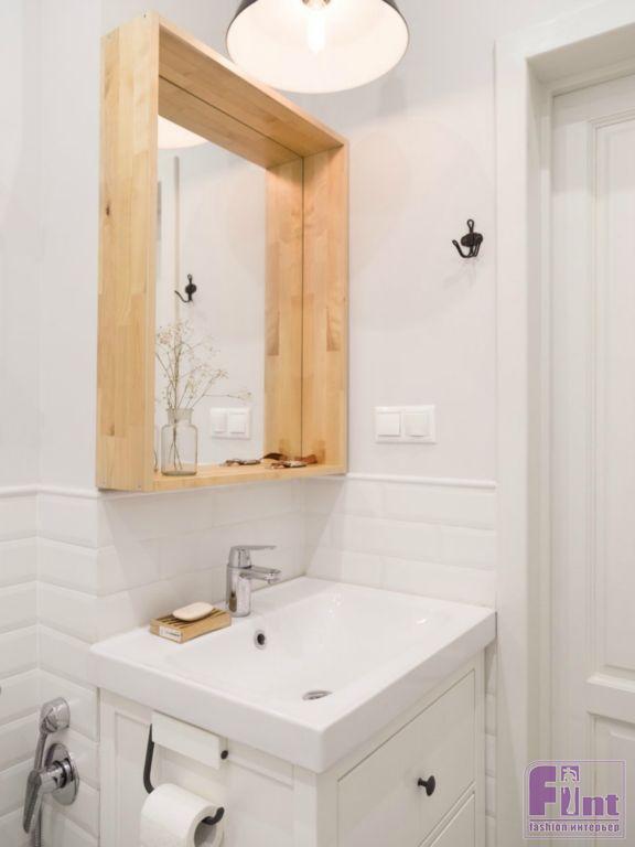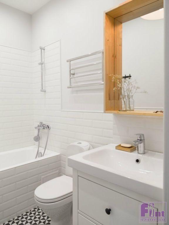 Благодаря тщательно спланированному пространству, в квартире удалось оборудовать полноценный санузел с ванной, хотя обычно в таких скромных по площади пространствах дизайнеры устанавливают более компактные душевые кабины. Несмотря на установленную ванную, санузел остался довольно комфортным, а благодаря преобладающему белому цвету, он выглядит ещё более просторным и светлым.