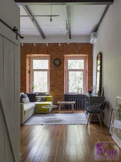 Дизайнеру повезло вдвойне: просторная однокомнатная квартира в старинном доме имела довольно высокие потолки и подлинную кирпичную кладку на внешней капитальной стене. Хозяйка квартиры — молодая девушка, оценившая по достоинству оригинальность помещения, — свое будущее пространство видела столь же просторным, каким оно и было изначально.
