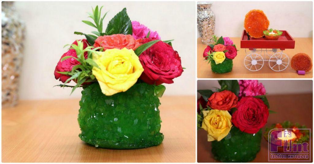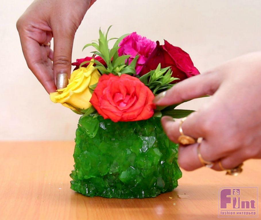 Готово! Осталось налить в нашу вазу немного воды и поставить в неё подходящие по размеру цветы. Наша удивительно красивая ваза из изумрудных кристаллов была сделана нами всего за одни сутки, зато результат получился ошеломляющим по красоте и необычности!