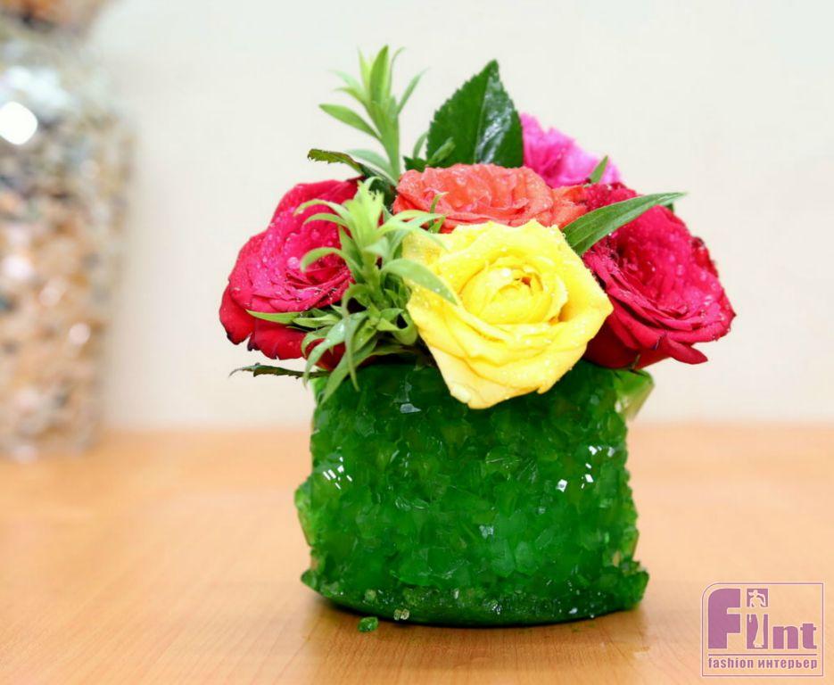 Готово! Осталось налить в нашу вазу немного воды и поставить в неё подходящие по размеру цветы. Наша удивительно красивая ваза из изумрудных кристаллов была сделана нами всего за одни сутки, зато результат получился ошеломляющим по красоте и необычности!