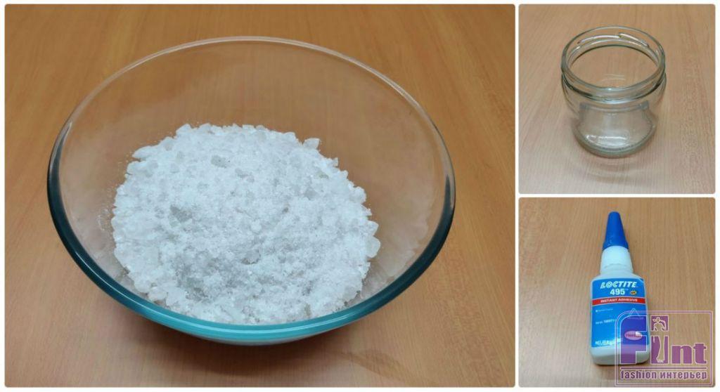 Кроме квасцового порошка для работы нам потребуется: подходящая стеклянная банка, обычный супер клей, небольшой отрезок проволоки, пищевой краситель изумрудного оттенка, кисть и любая посуда для измельчения (ступка). Также для приготовления раствора нам будут нужны подходящие ёмкости и сковорода с антипригарным покрытием.