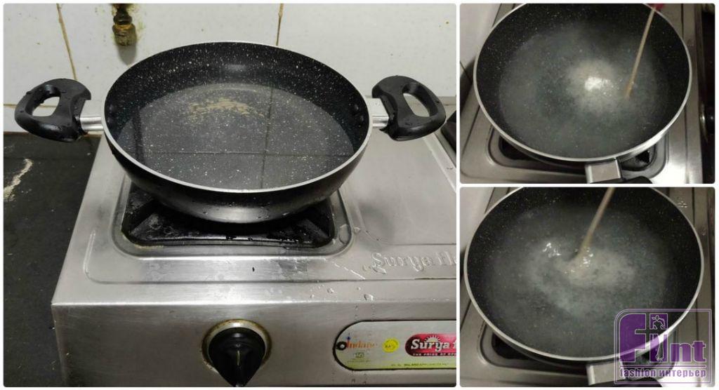Чтобы начать выращивать кристаллы, нам необходимо сделать насыщенный раствор квасцов в горячей воде. Чем насыщенней будет раствор, тем активнее будут формироваться кристаллы. Обычно квасцы лучше растворяются в горячей воде, поэтому сначала греем воду в обычной антипригарной сковороде. Отмерьте количество воды, необходимое для того, чтобы наша банка была полностью погружена в неё. Доведите воду до кипения и добавьте в неё квасцовый порошок. Продолжайте добавлять порошок при непрерывном помешивании, до тех пор, пока порошок не перестанет растворяться. Так мы получим насыщенный раствор квасцов.
