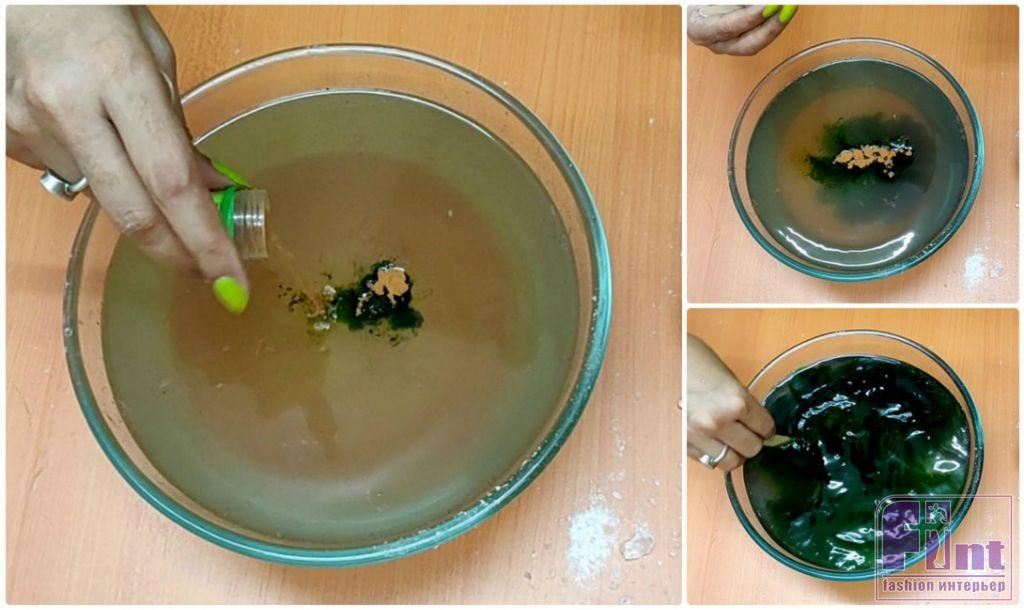 Перелейте горячий квасцовый раствор в подходящую ёмкость. Она должна быть достаточно большой, чтобы в неё полностью поместилась наша стеклянная банка и достаточно термостойкой, чтобы выдержать горячий раствор. Добавьте пищевой краситель, на глаз определяя нужный вам цвет. Тщательно размешайте, чтобы краситель равномерно распределился в растворе. Пищевые красители бывают в жидкой и порошковой форме. Удобнее пользоваться жидким красителем, но и порошковый тоже отлично справится с нашей задачей.