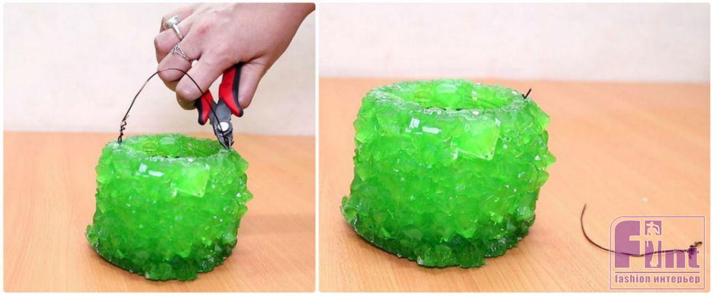 Примерно через 24 часа вы можете проверить, насколько выросли кристаллы на нашей банке. Если вы сочтёте объём роста кристаллов достаточным для будущей вазы, вытащите банку, удерживая её за проволочную «ручку». Вытягивайте осторожно и медленно, чтобы кристаллы не треснули. Аккуратно отрежьте проволоку максимально близко к поверхности кристаллов. Используйте для этого острые кусачки или другой подходящий инструмент.
