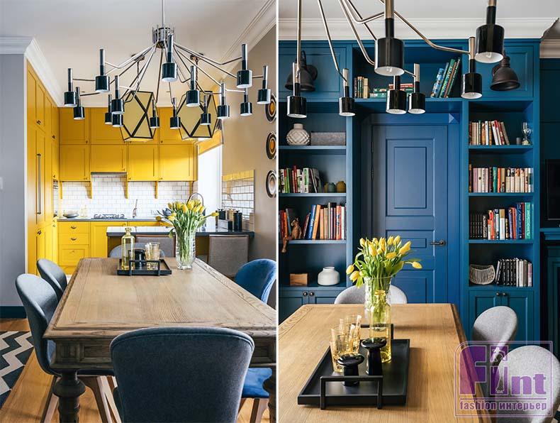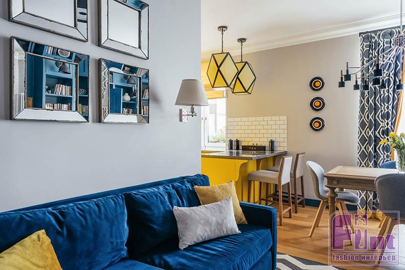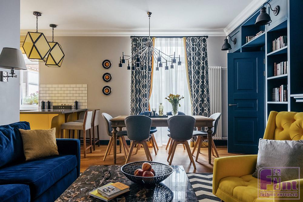 Квартира достаточно тёмная, поэтому максимально трепетно дизайнеры отнеслись к разработке светового сценария. Помимо основного освещения, в квартире появились люстры, бра, напольные светильники и лампы. Цветовая палитра квартиры строится на глубоких синих и задорных жёлтых оттенках, которые играючи сочетаются, сменяя друг друга из комнаты в комнату. Взрыв ярких цветов пришёлся на зону кухни и гостиной: здесь «канареечная» кухня и гостиная глубокого синего цвета. Спокойные тона Надя приберегла для кабинета и спальни, динамики дизайнер добавила с помощью принтов на текстиле, а провокационную геометрию оставили для ванной комнаты.