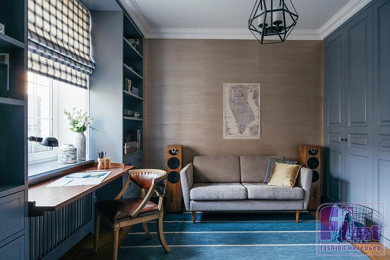 Для этого проекта все системы хранения изготовили на заказ по собственным эскизам. В гостиной вдоль стены расположился вместительный стеллаж для книг и журналов. В кабинете у подоконника - стол, а по бокам очень кстати пришлись шкафы с ящиками для документов и других мелочей. Сделав ставку на практичность, дизайнеры студии Enjoy Home заказали вместительную кухню с фасадами «в потолок», теперь у хозяйки точно не возникнет проблем с хранением большого количества посуды.