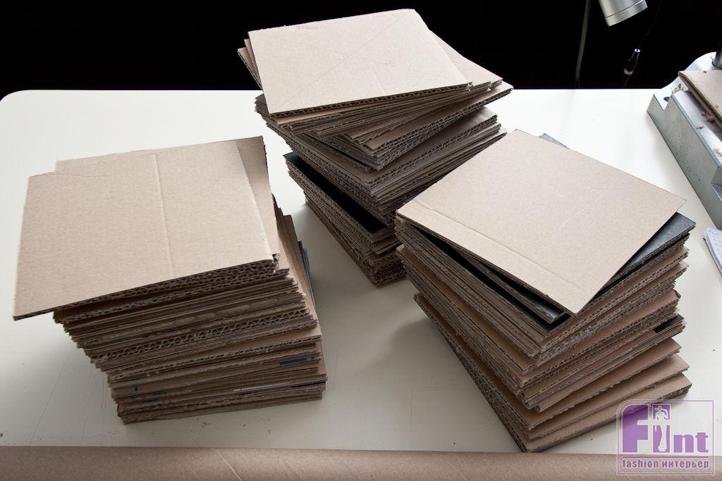 Пока наши цементные или гипсовые изделия сохнут, можно приступить к нарезанию картонной «начинки». Для этого нужно взять несколько подходящих коробок из гофрокартона толщиной примерно 4-5 мм. На самом деле, вы можете использовать картон любой толщины. Важно, чтобы картон был по толщине одинаковым. Из картона необходимо нарезать квадратные фрагменты со стороной 15-16 см. Количество фрагментов подсчитать сложно. Важно, чтобы они, сложенные в стопочку, превышали длину нашего металлического стержня, на который они будут надеваться. После нарезки картонных квадратиков их нужно просверлить ровно по центру. Для этого лучше воспользоваться дрелью и сверлом подходящего диаметра (8 мм). Сверлить лучше сразу несколько заготовок, сложив их вместе.