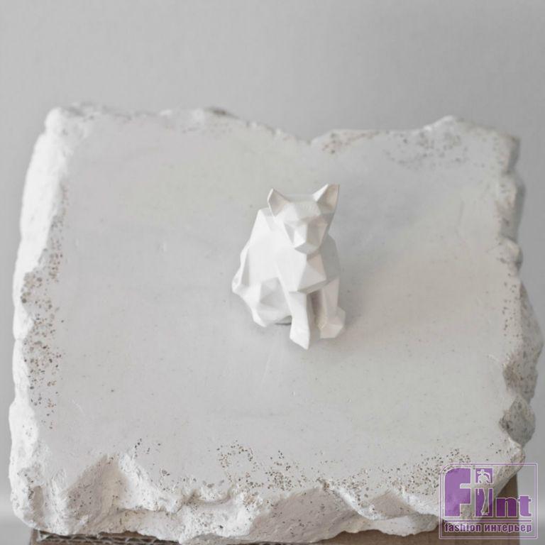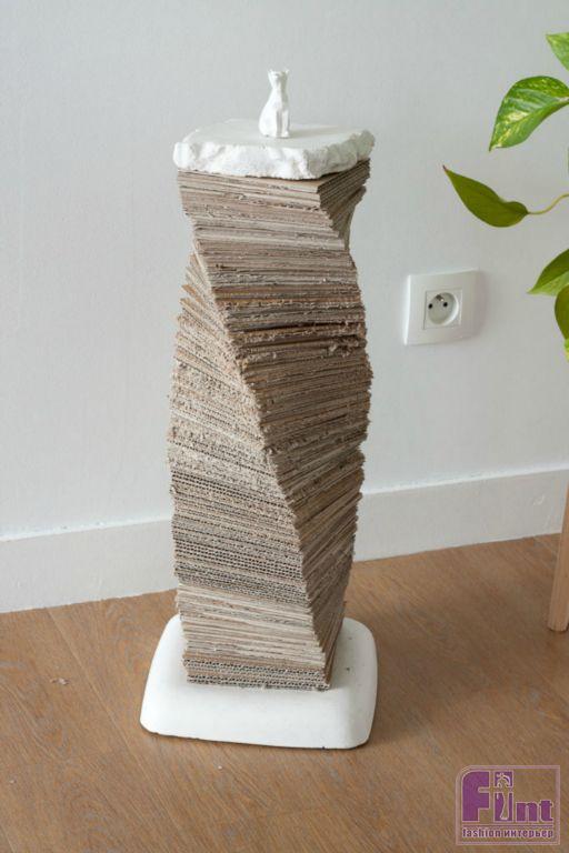 После того, как наши гипсовые или цементные изделия полностью высохнут, удалите их из форм, в которых они застывали и обработайте наждачной бумагой, чтобы придать им более эстетичный вид. Затем закрепите в основе металлический прут, затянув его с двух сторон гайками с шайбами. Затем наступает время окончательной сборки когтеточки. Нанизывайте картонные квадратики, постепенно смещая их относительно друг друга, чтобы получилась спиральная конструкция. Придавите картон верхней частью когтеточки и скрутите всю конструкцию гайкой. Чтобы гайка на верхней части когтеточки не вызывала у нас эстетический диссонанс, её можно замаскировать подходящей пластиковой фигуркой кошки, в основании которой нужно проделать углубление под штырь и гайку. Чтобы наша фигурка не выглядела на верхней части инородным телом, её лучше покрасить в белый цвет, как и цементные или гипсовые части когтеточки.