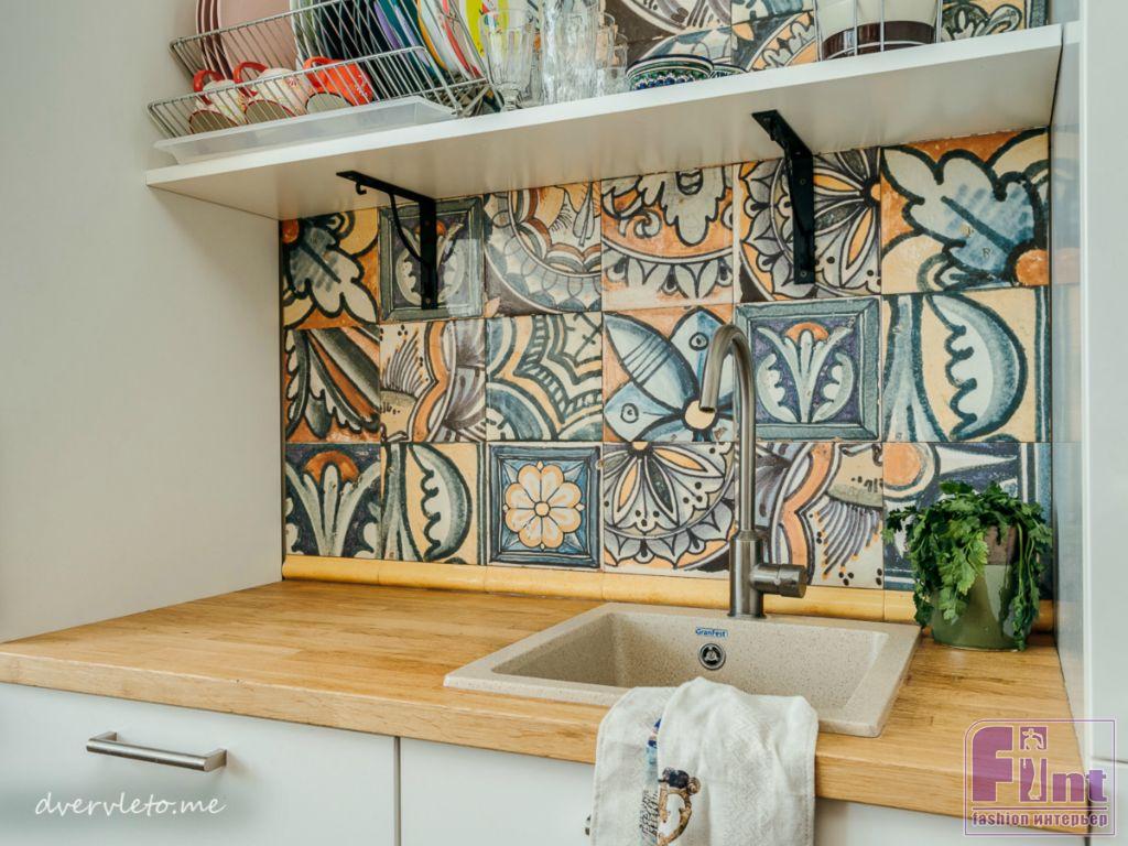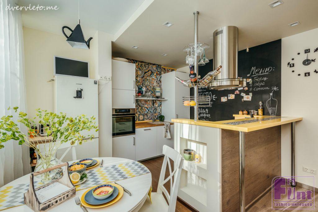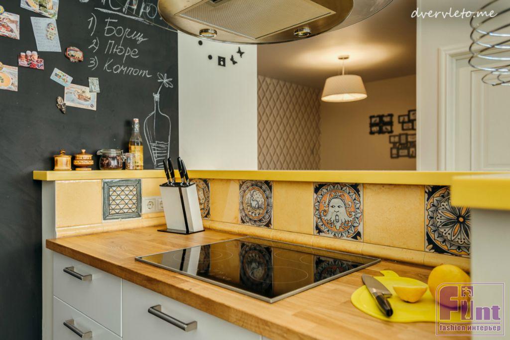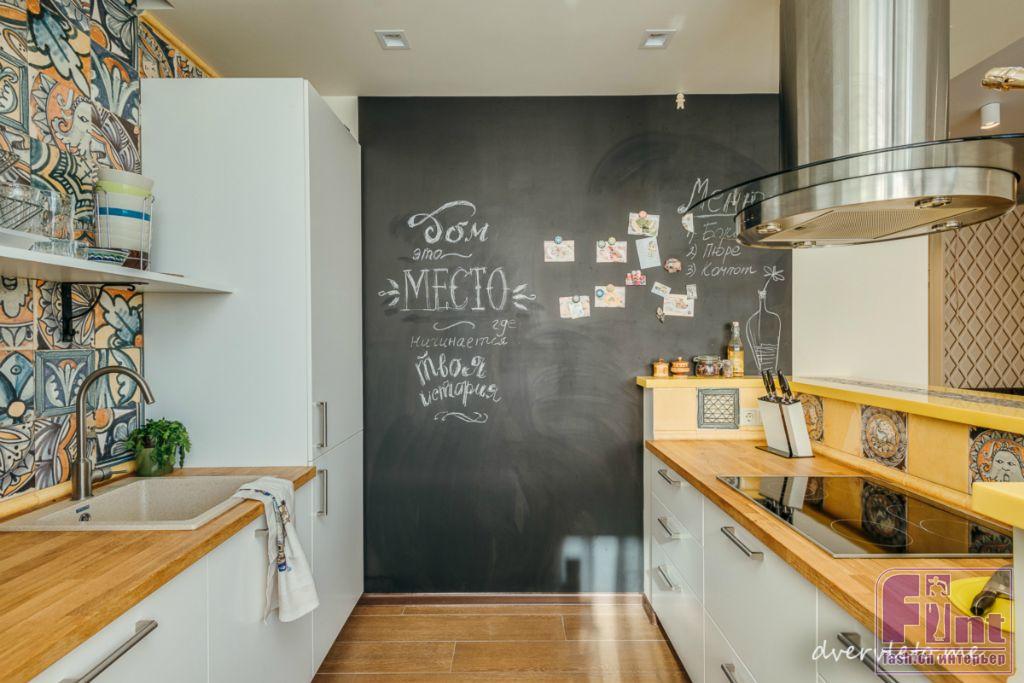 Нашлось в квартире место и для нестандартных решений. Таким стала, например, грифельная краска вместо обычной доски на кухне, а также мозаика, вплавленная в полимерную столешницу.