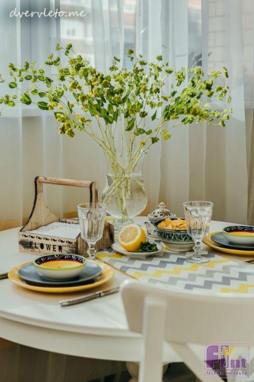 Интерьер выполнен на стыке нескольких стилей: в гостиной доминирует скандинавский стиль с его воздушностью и цветовой приглушённостью, кухня получилась ярким акцентным пятном, а приватная зона включила в себя элементы тайского стиля — перегородки, кушетку у окна, спокойную бежевую расцветку.