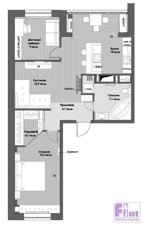 Алёне Николаевой предстояло оформить двухкомнатную квартиру для молодой пары. Первое и важнейшее пожелание заказчиков касалось перепланировки: вместо «двушки» хозяева непременно хотели получить «трёшку», при этом максимально увеличив санузел и сделав более просторной кухню. Пожелания по стилю и дизайну: максимально функциональный интерьер. Эклектика, минимализм, ар-деко, тайский стиль и восточные мотивы.