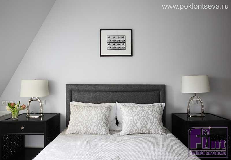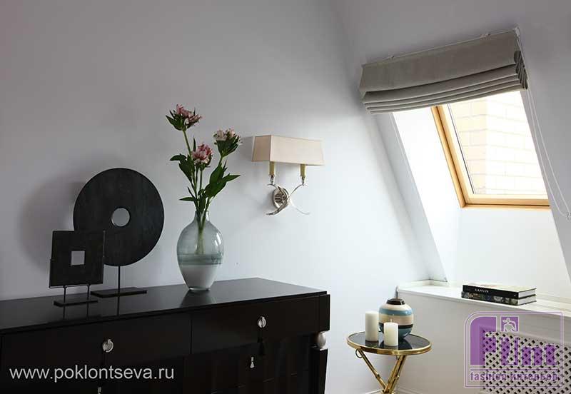 Гостиная отделена от кухни стеклянным порталом под потолок, такая прозрачная конструкция визуально увеличивает площадь гостиной. Особое внимание Марине пришлось уделить хозяйской спальне. «Так как окна низкие и мансардные, мне пришлось искать способ, как римскую штору повесить под наклоном и чтобы она работала, как обычно, — вспоминает Марина. — Мы придумали натянуть вдоль стены под наклоном тросы из невидимой, но очень крепкой лески, а к шторе пришили петли, которые крепились за эту леску. Я ни разу не видела такую же реализацию текстильного оформления мансардных окон».