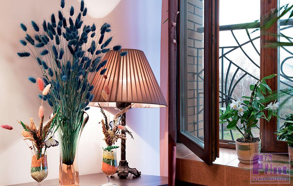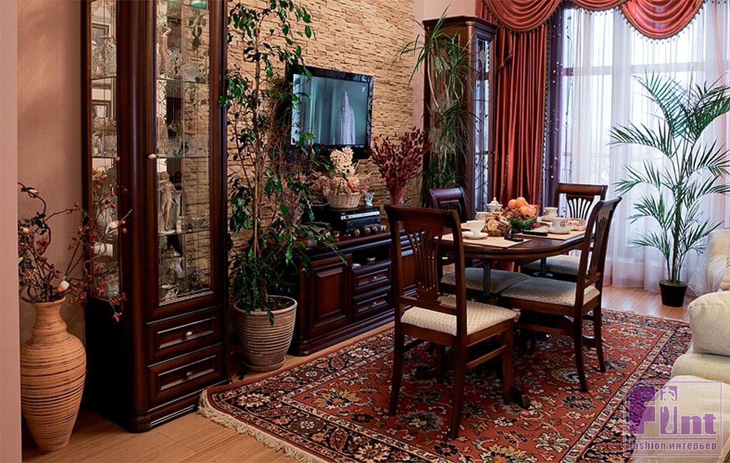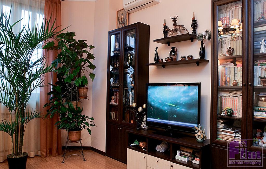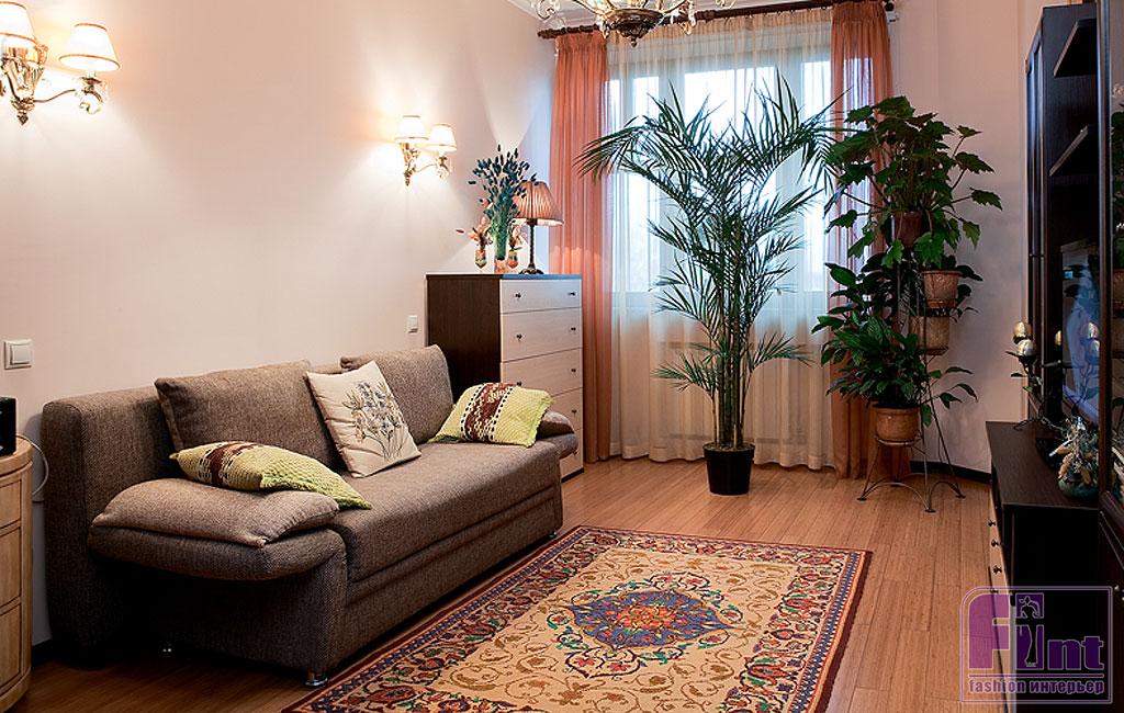 Ольга, любительница природы, украсила свою квартиру тропическими и субтропическими растениями. Экзотические деревья подчеркнули классическую направленность интерьера (начиная с конца девятнадцатого века в интерьерах неизменно присутствуют «пальмы в кадках») и одновременно придали ему намёк на ориентальность. По-другому стали смотреться бамбуковый паркет, плитка на полу, стилизованная под камень, мебель из ротанга и дерева венге, а также облицовочный «дикий камень» на стене в гостиной.