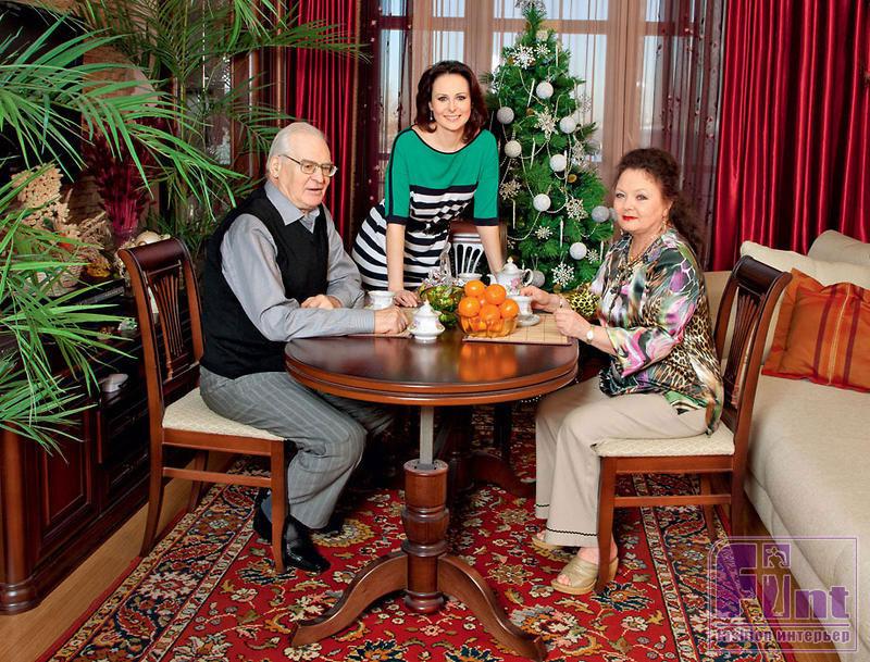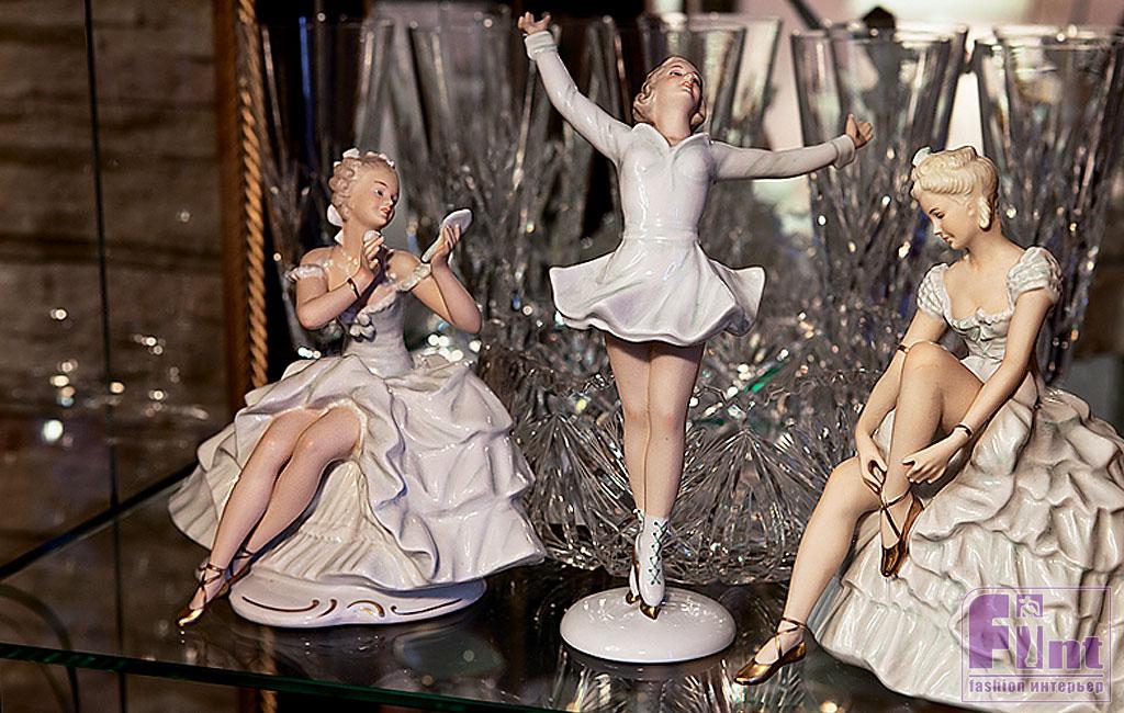 При выборе дизайна для новой квартиры тон задавали не только ковры, были еще балерины, фигуристки и просто красивые женщины — уникальная коллекция фарфоровых статуэток, которую бабушка актрисы также привезла из Германии. И если ковры ещё могли бы существовать в каком-нибудь ином стиле, будь то ориентальный или минималистский, то коллекция фарфора органично смотрелась бы только в классическом интерьере. Вот так ковры и старинный фарфор предопределили дизайн интерьера квартиры. Под антикварные аксессуары была приобретена немецкая мебель, как будто из тех далёких лет, стилизованные современные люстры, настольные лампы, бра с абажурами. А для собрания статуэток были куплены две витрины с подсветкой, которые были поставлены в специальные ниши в стене.