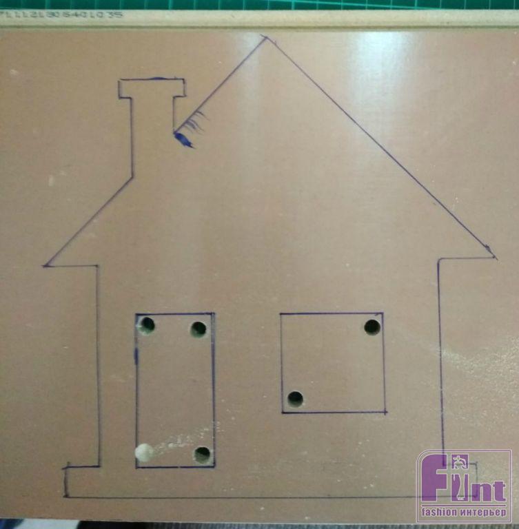 Уберите шаблон и просверлите небольшие по диаметру отверстия в углах двери и окна – они понадобятся нам для выпиливания этих деталей электрическим лобзиком. Выпиливайте изделие по шаблону, стараясь максимально близко подходить к контурной черте и вести лобзик ровно.