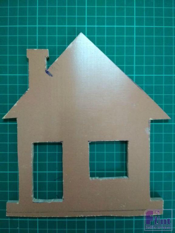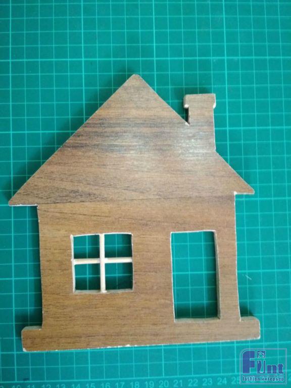Совет: Сначала вырежьте мелкие детали (окно и дверь), а затем вырезайте домик по внешнему контуру. Не забудьте перевернуть шаблон, прикладывая его к изнаночной части доски, чтобы наш домик не получился «зеркально» отображённым.