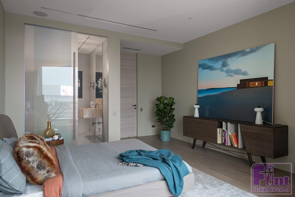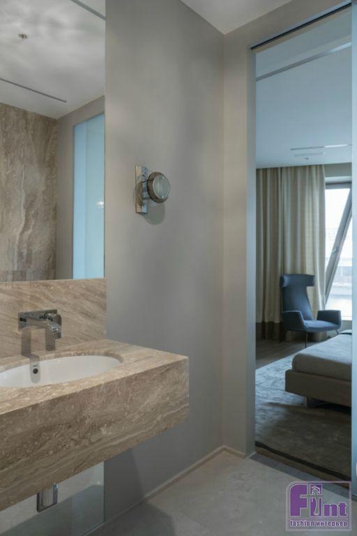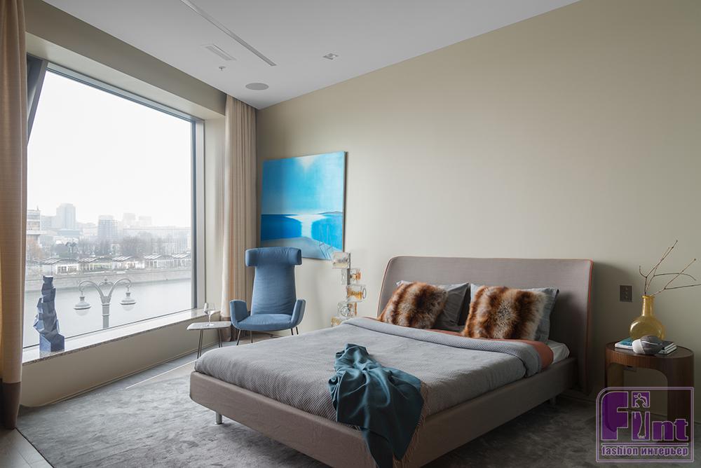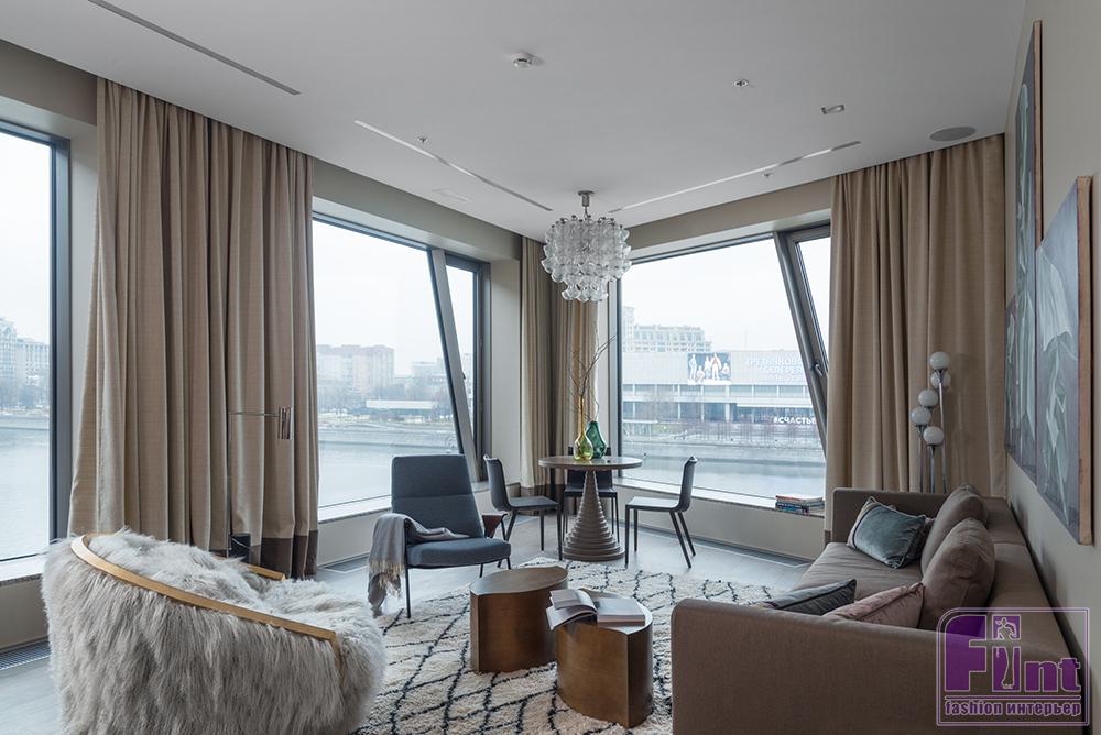 Превосходные видовые характеристики определили и некоторые конкретные решения. Так, например, санузел и спальню отделяет стеклянная перегородка — любоваться открывающимся видом на ЦДХ и Москву-реку можно лёжа в ванной. При желании стекло можно сделать непрозрачным — достаточно нажать кнопку на пульте. В проекте нашлось место и другим «умным» элементам: в потолок просторной гостиной вмонтировали музыкальную систему класса Hi-End, которая работает от смартфона, а также установили несколько уровней декоративной подсветки.