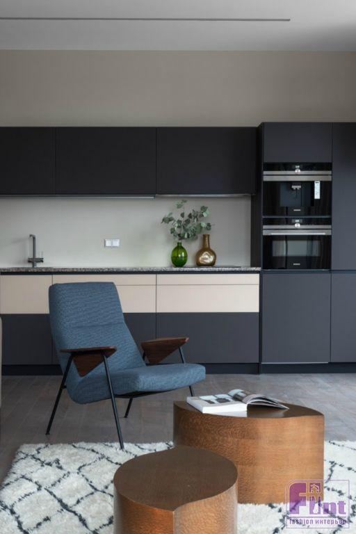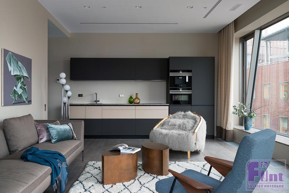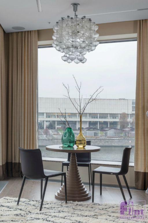 Интерьер апартаментов наполнен воздухом, свободным пространством и натуральными отделочными материалами. Так, столешница на кухне и все низкоуровневые подоконники в апартаментах выполнены из натурального гранита коричнево-красного оттенка. Минималистский кухонный гарнитур украшен стильными фасадами из матового стекла. В проекте использовали трёхметровые двери, заканчивающиеся прямо под потолком, со шпоном эвкалипта, рисунок которого напоминает рябь воды на реке за окном. Такое необычное решение по использованию высоких дверных полотен ещё больше «приподняло» потолки, добавив апартаментам простора и уюта.