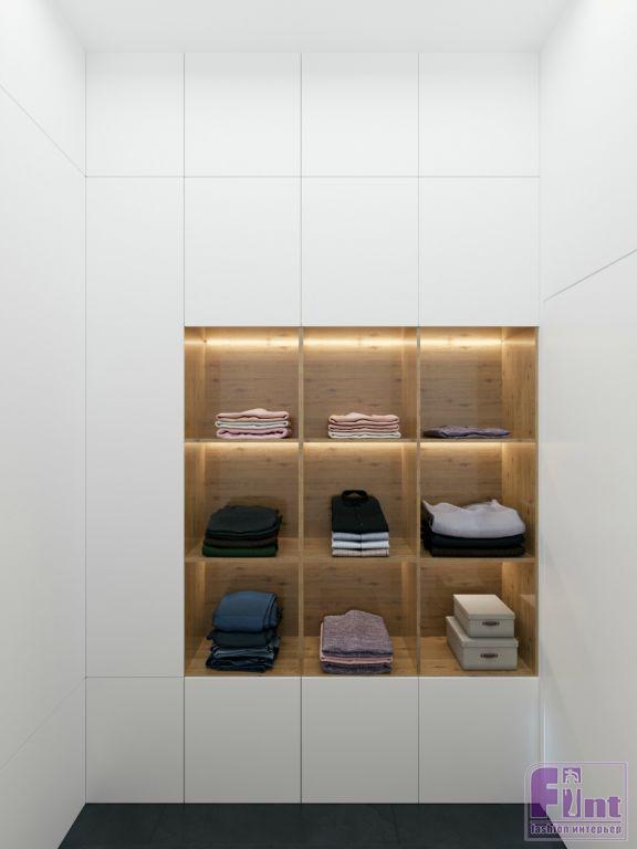 Небольшая часть шкафа оставлена открытой и снабжена дополнительной интерьерной подсветкой. В этой зоне предполагается хранение повседневных вещей, доступ к которым должен быть максимально удобным и быстрым.