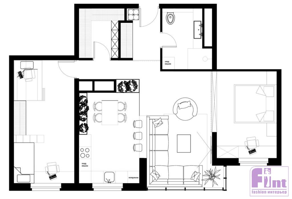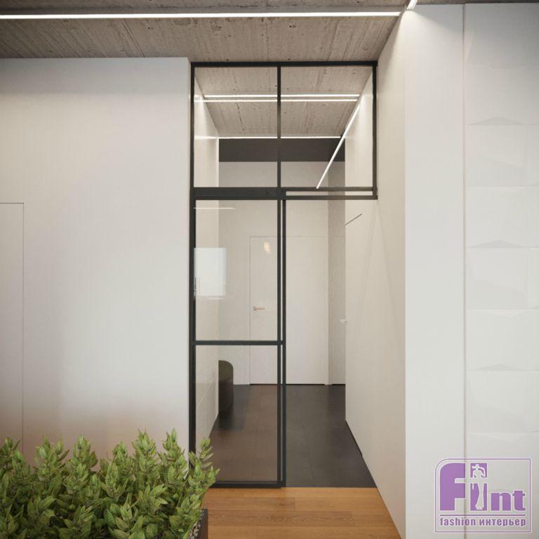 Несмотря на ограничения, которые накладывали несущие стены, авторам проекта удалось объединить кухню с гостиной, а спальню отделить с помощью прозрачных перегородок. Основными материалами в дизайне интерьера стали бетон и дерево, поэтому стилистически квартира тяготеет к лофту. Композиционной доминантой интерьера стала кухня, установленная на подиуме и выделенная черным цветом. В итоге кухня стала одним из самых непростых и привлекательных элементов проекта, включающим встроенные кашпо, подиум и барную стойку.