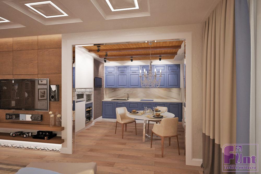 Для основного кухонного функционала спроектировали нишу, встроили в неё колонны со всевозможной кухонной техникой, цвет которой специально подбирали под белые фасады мебели на левой стене так, чтобы он одновременно сочетался с пастельно-голубыми фасадами кухни на торцевой стене помещения.