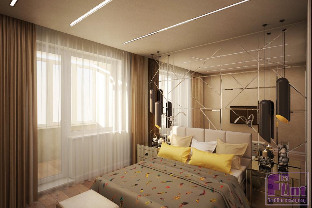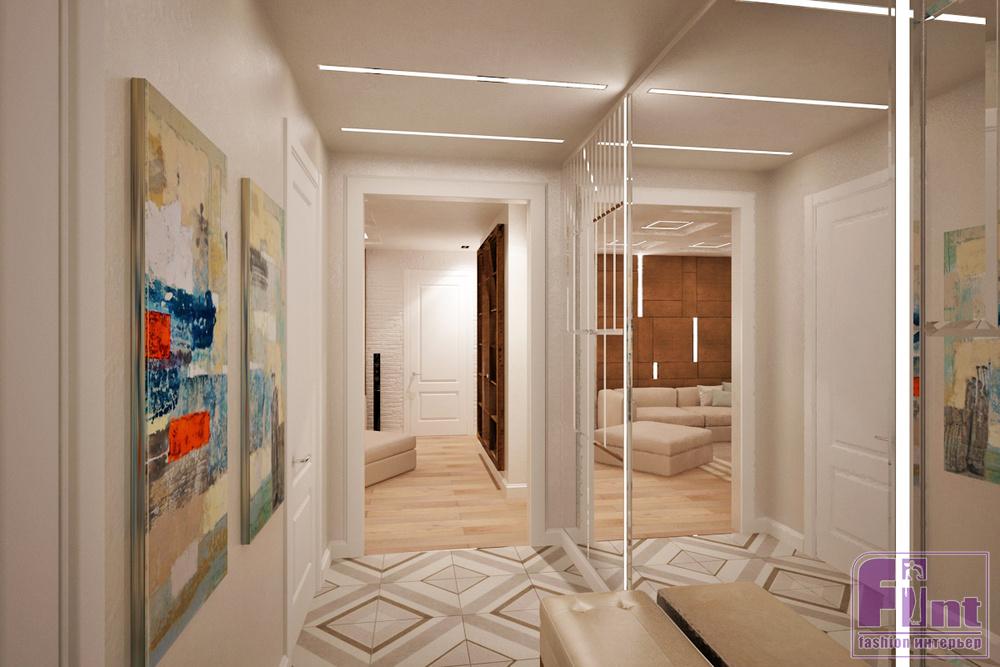 Во всём проекте для визуального увеличения пространства использовали много зеркал, причем не обычных ровных поверхностей, а своеобразного «зеркального калейдоскопа». Зеркалами декорирована арка, разделяющая кухню-столовую от гостиной. Зеркала выбраны в качестве задней стенки для открытого стеллажа в гостиной, а системы хранения в коридоре имеют полностью зеркальные двери, что значительно расширяет довольно узкий изначально коридор. Хозяйская спальня дополнена целой стеной из зеркал, выполненных в формате геометрической мозаики.