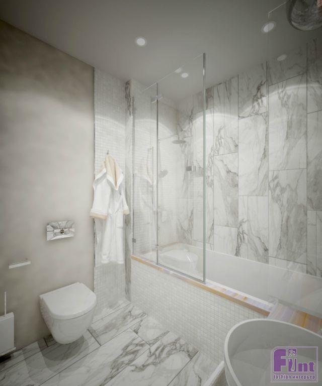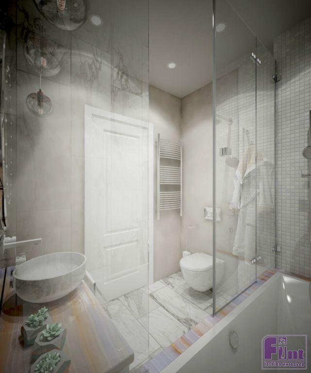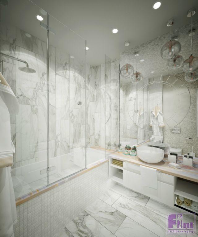 Санузел оформлен в светлых тонах и монохромной гамме. В помещении также много зеркал и стекла, что также помогает зрительно увеличить пространство. В отделке гармонично сочетаются крупноформатные керамические панели «под мрамор» и довольно мелкая мозаичная плитка квадратной формы.