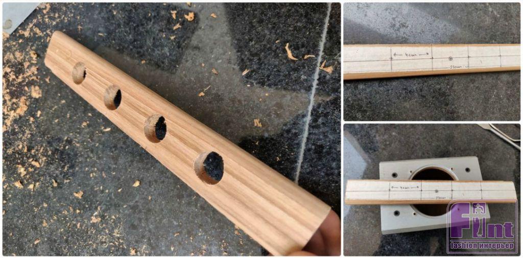 Мы провели разметку следующим образом: нашли центр бруска и отложили от него в обе стороны 2 см и ещё 4 см, получив 4 точки для сверления.