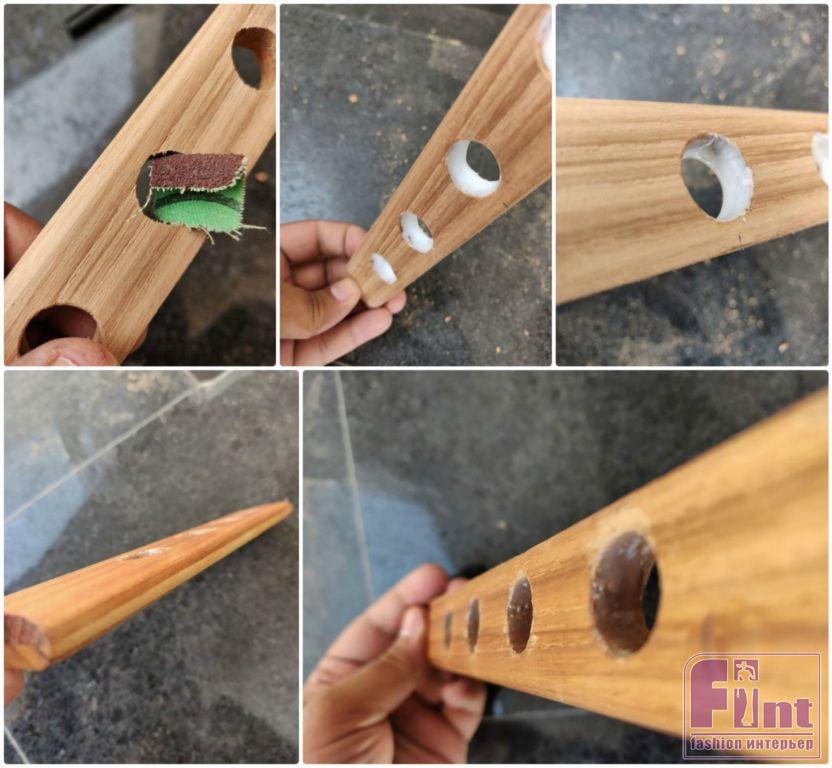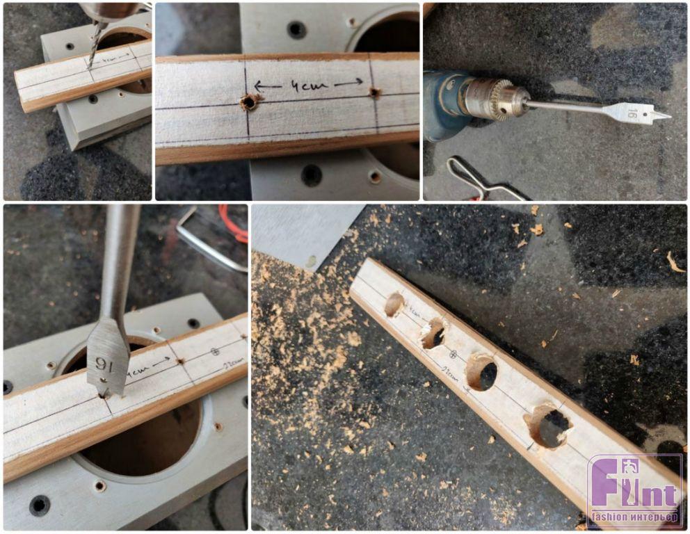 Для начала можно просверлить направляющие отверстия тонким 3-миллиметровым сверлом, чтобы затем было удобнее работать перьевым сверлом по дереву. После того, как вы просверлите отверстия, их необходимо также обработать наждачной бумагой, чтобы удалить появившиеся сколы древесины и заусенцы. Затем, чтобы защитить внутреннюю часть отверстий от попадания влаги, их необходимо покрыть клеем для дерева. После высыхания клея, нашу заготовку следует полностью покрыть воском для защиты деревянных изделий и тщательно её отполировать.
