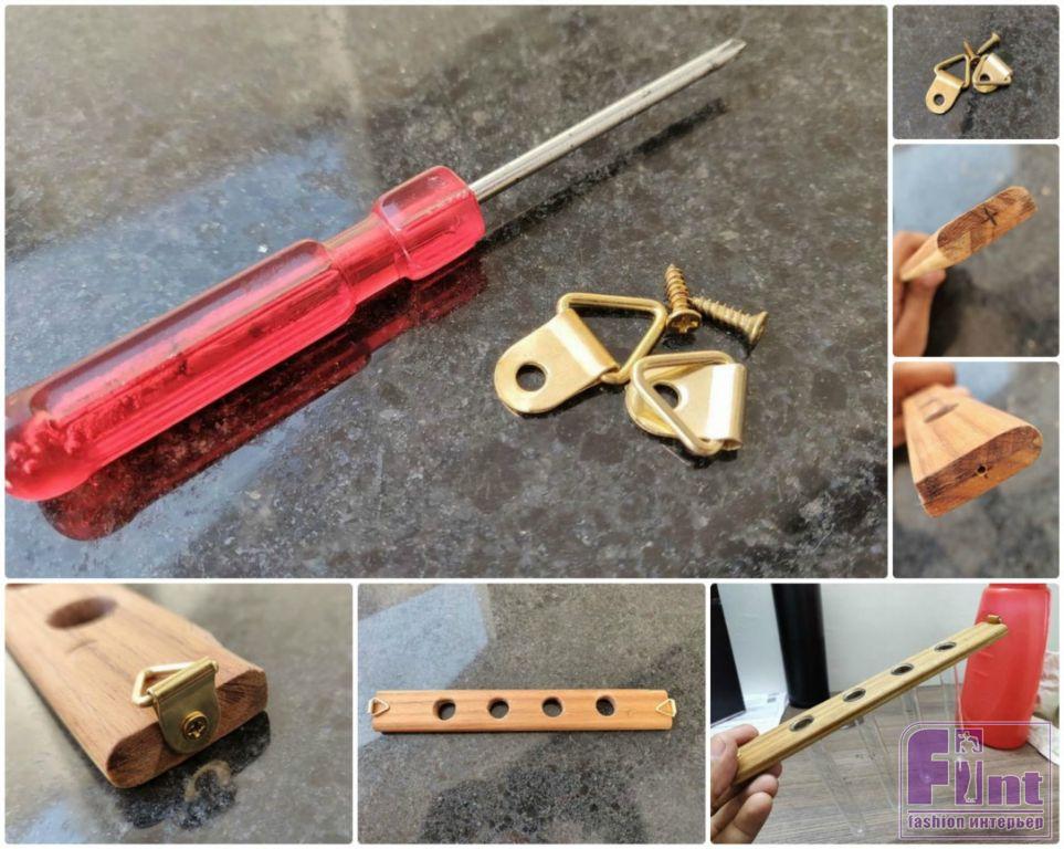 Для того чтобы подвесить наше кашпо на стену, нам необходимо прикрепить к бруску специальные крепления для навешивания картин. Для этого просверлите в центральной части торцов бруска отверстия диаметром примерно 2 мм, чтобы в них вошёл крепёжный шуруп и наш брусок не раскололся от вкручивания шурупов. С помощью крестообразной отвёртки прикрутите крепежи к торцам бруска.