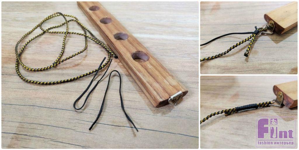 Затем, при помощи отрезков проволоки, которой скручивают провода у новых гаджетов, следует закрепить декоративный шнурок, отмерив его длину, необходимую для крепления кашпо на стене. Пропустив концы шнурка в крепежи на торцах бруска, аккуратно закрепите их с помощью проволоки, намотав её плотными витками.