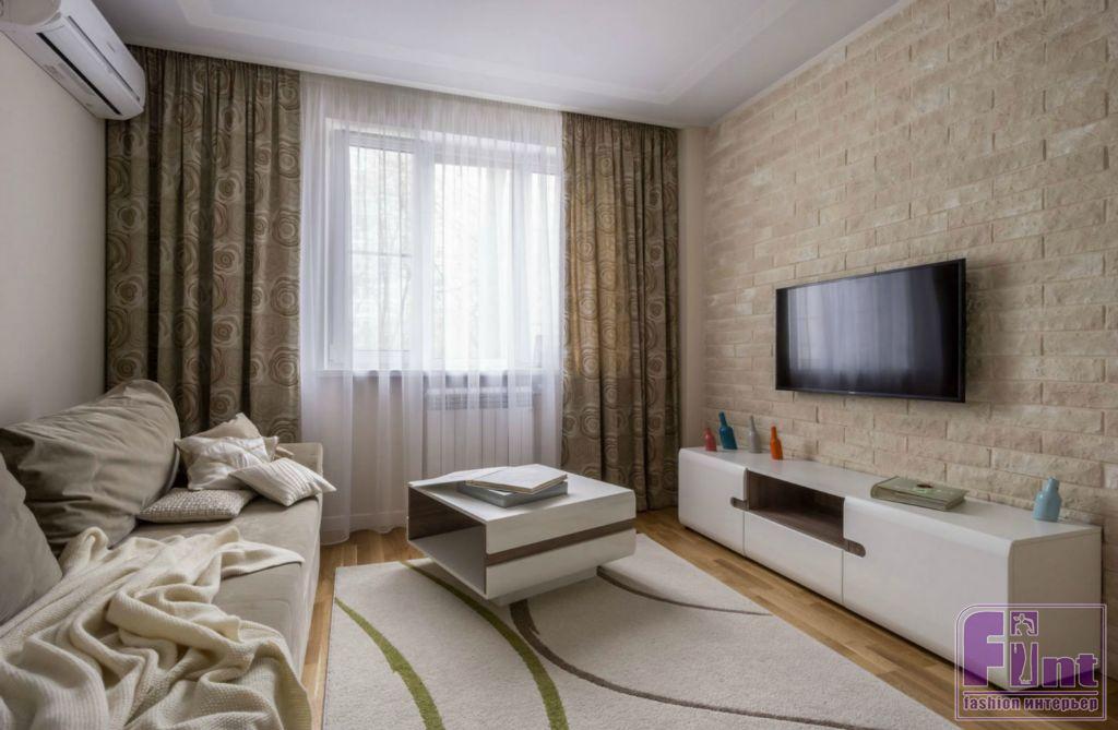 Однако на фоне пастельной отделки не забыли про акценты. Так, на кухне нашлось место стульям небесного цвета и яркой стене в шоколадной гамме, а в гостиной — стене с декоративным камнем.