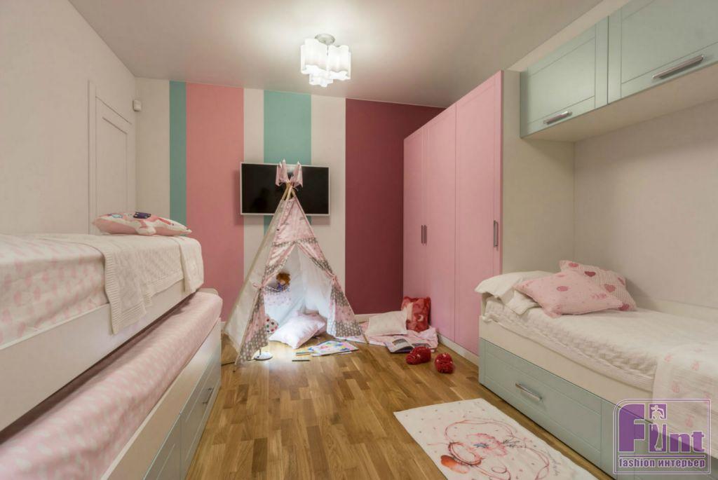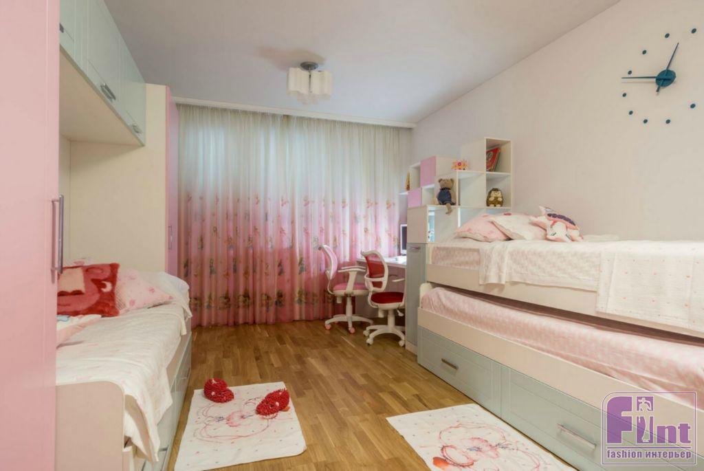 «Непростая задача стояла передо мной и в размещении трёх детских кроваток и двух рабочих столов, в сравнительно небольшой комнате — 18,80 «квадратов», причём одним из условий заказчицы было, не делать высокие двухъярусные кровати, так как дети еще маленькие, — рассказывает Анастасия. — Вся мебель в детской сделана полностью по моим чертежам, и двухъярусной кровати избежать не удалось, но выполнена она так, чтобы высота второй кровати была минимальной, а нижняя — не оказалась совсем на полу».