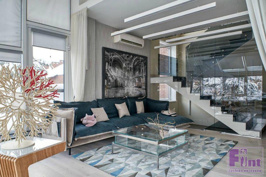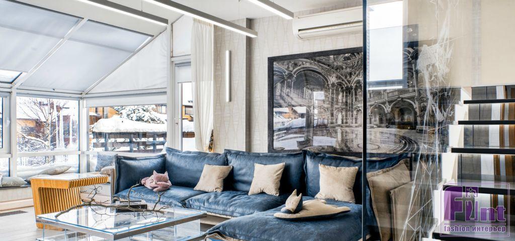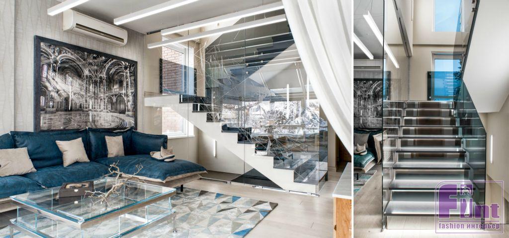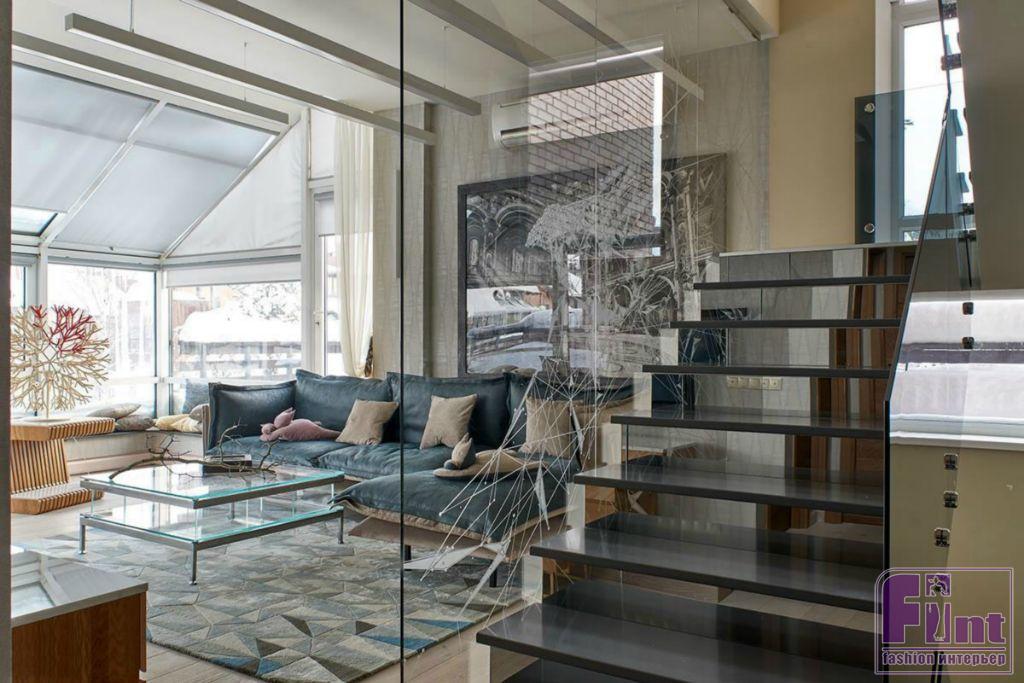 Старую бетонную лестницу заменили на современную, со стеклянными перилами из тёмного закалённого стекла толщиной всего 10 мм. Сами ступени выполнены из кварца в сером цвете, а перегородки между ними изготовлены из тонированного стекла. При желании на лестнице можно включить подсветку ступеней, что очень важно для загородного дома в условиях длительного отсутствия солнечного света в наших северных широтах. Зимний сад от лестничного проёма отделили перегородками из такого же ударопрочного остекления, на которые нанесены ненавязчивые абстрактные рисунки.