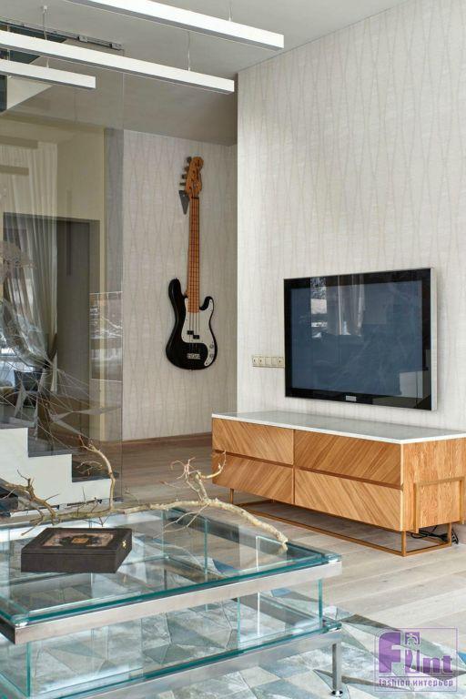 Так как хозяин не любит яркости и лишних деталей, в комнате решили установить минимум мебели. К основной стене поставили один большой диван, а напротив него поставили комод и панорамный телевизор. Рядом с окном, выходящим во двор, установили кресло из натуральной кожи молочного цвета. Особенностью этого кресла является вместительный бельевой ящик. Так же в интерьере присутствуют два журнальных стола из стали, стекла и дуба. Общий дизайн комнаты получился мужской, но очень светлый, воздушный и немного индустриальный.