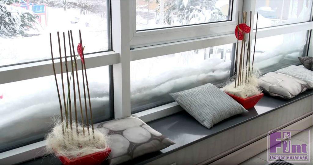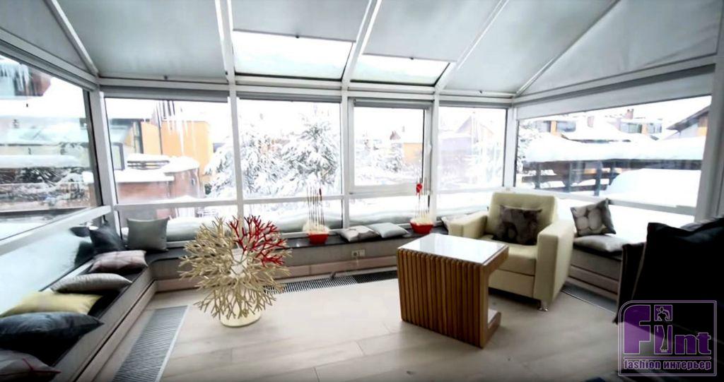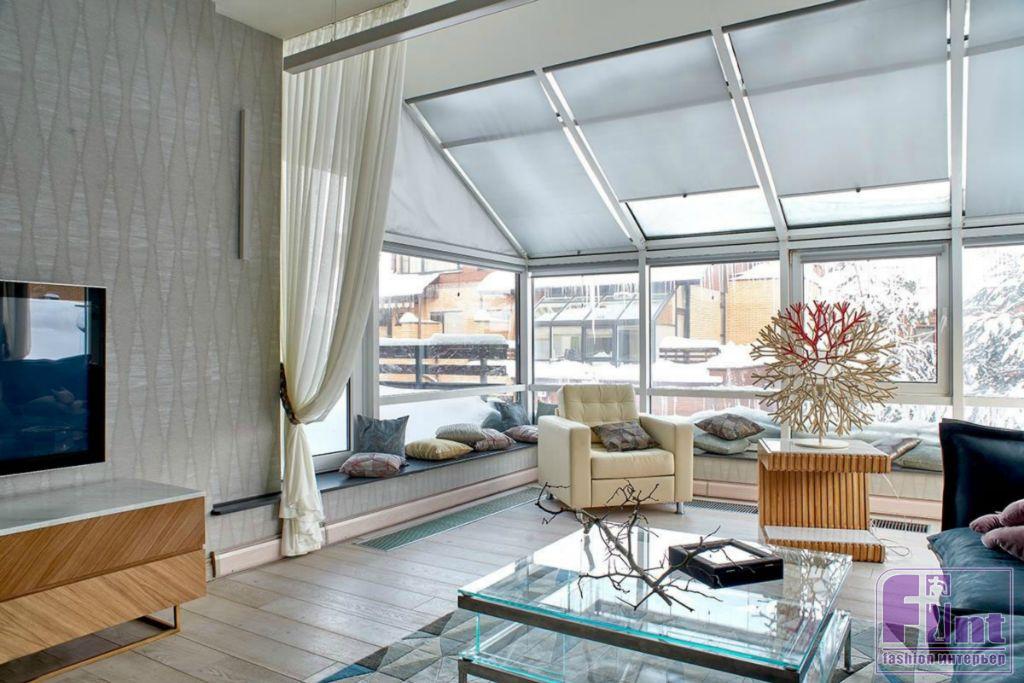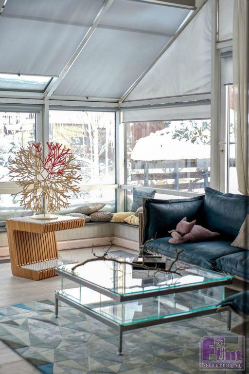 В помещении уложили новый паркет светлого цвета, установили тёплые плинтусы и встроенные конвекторы для обогрева. По оценке специалистов, такие отопительные приборы просто необходимы в помещениях с большим количеством остекления. Декорировали всё белоснежными шторами из почти невесомой вуали.
