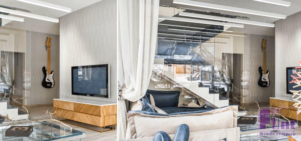 Для такого довольно оригинального интерьера были тщательно подобраны схемы освещения. В дизайне интерьера были использованы линейные светильники, которые стали главным источником света: на потолке, на стенах и даже в качестве подсветки ступеней. При разработке интерьера дизайнеров вдохновила первая профессия музыканта: ведь Александр Маршал - лётчик и очень любит небо. Поэтому дизайнеры постарались максимально облегчить интерьер и наполнить его воздухом и простором. Увидев результат, известный артист был приятно удивлен выполненным ремонтом.