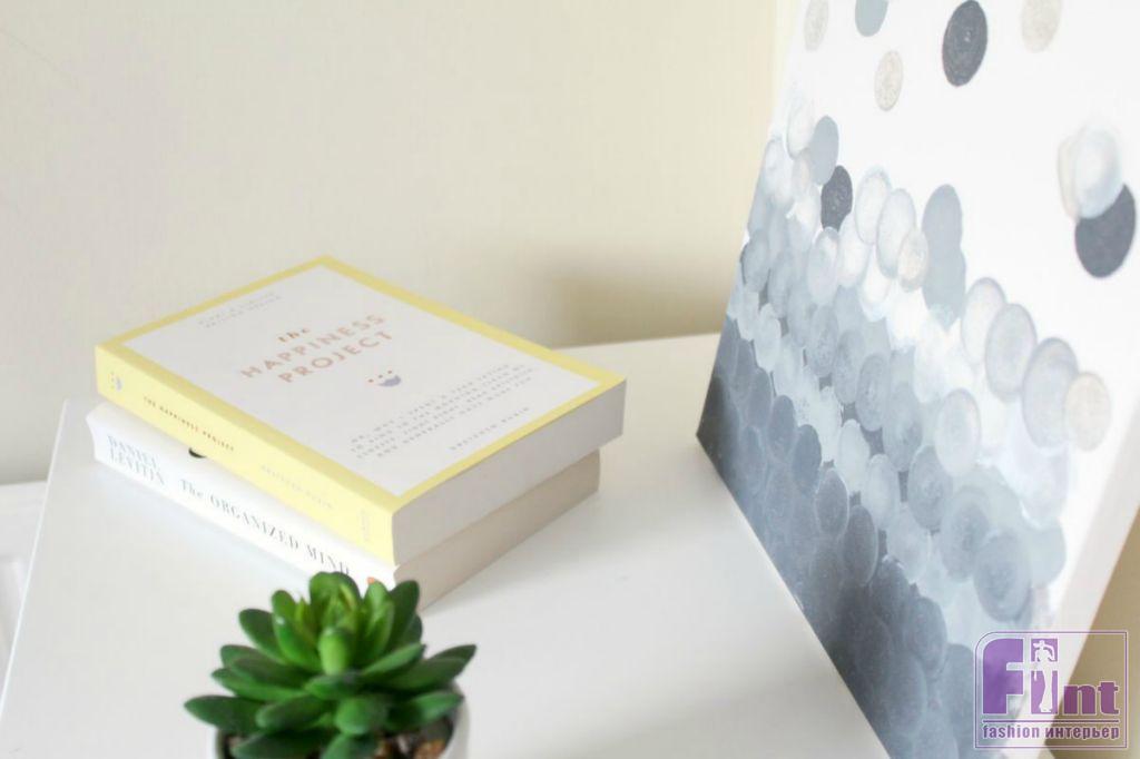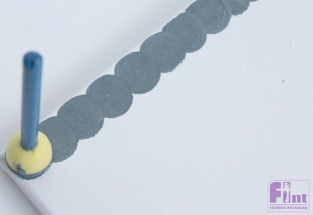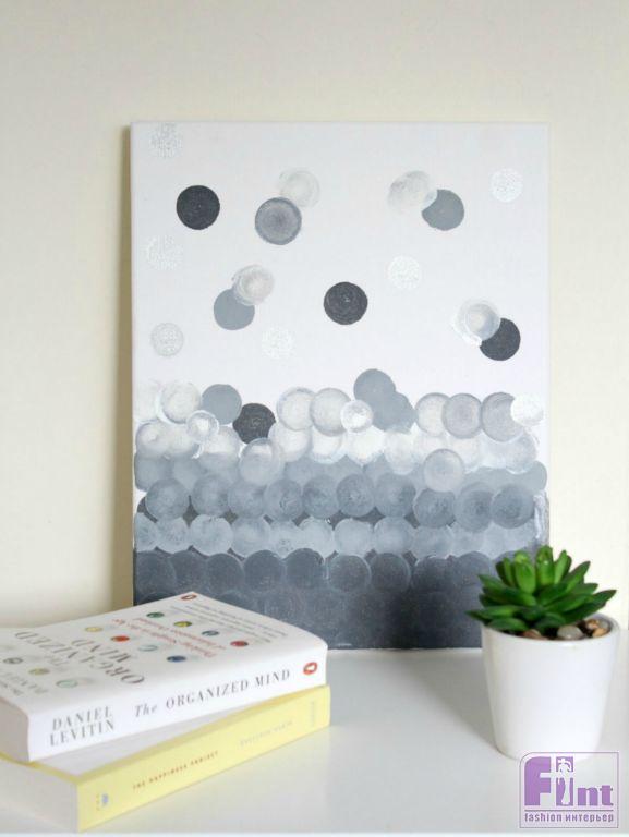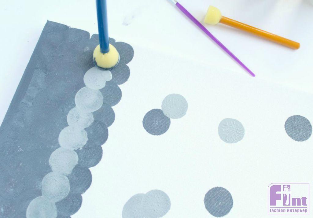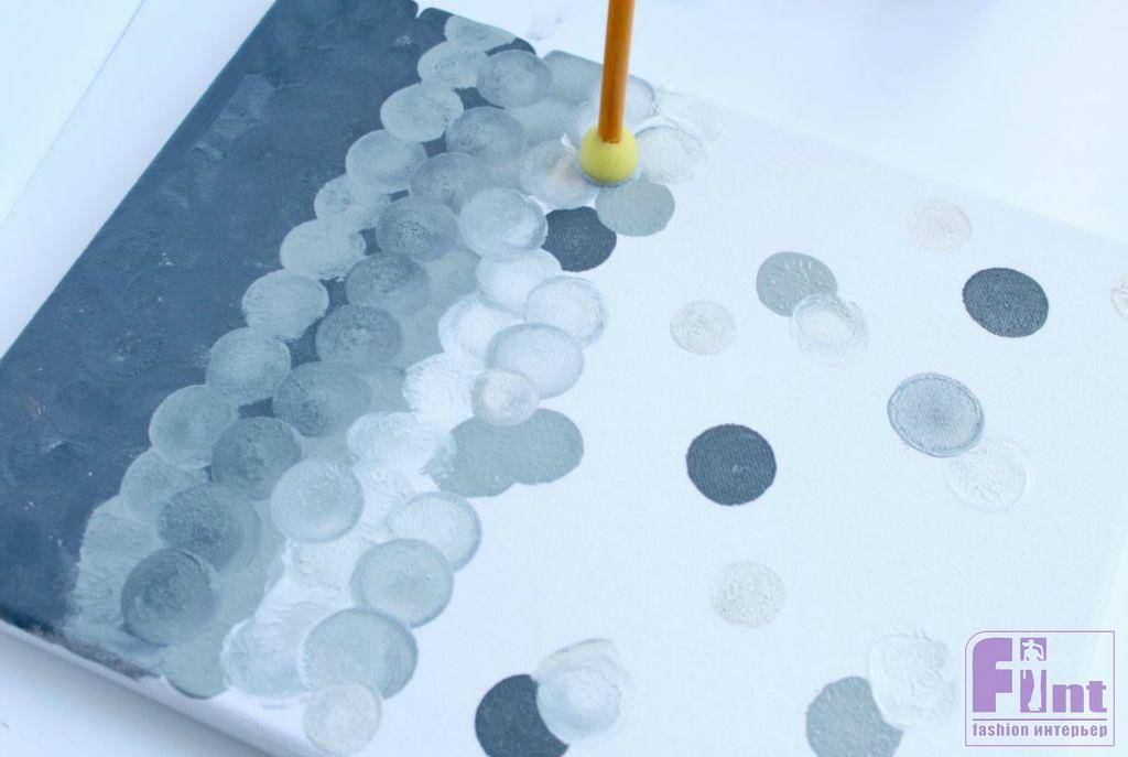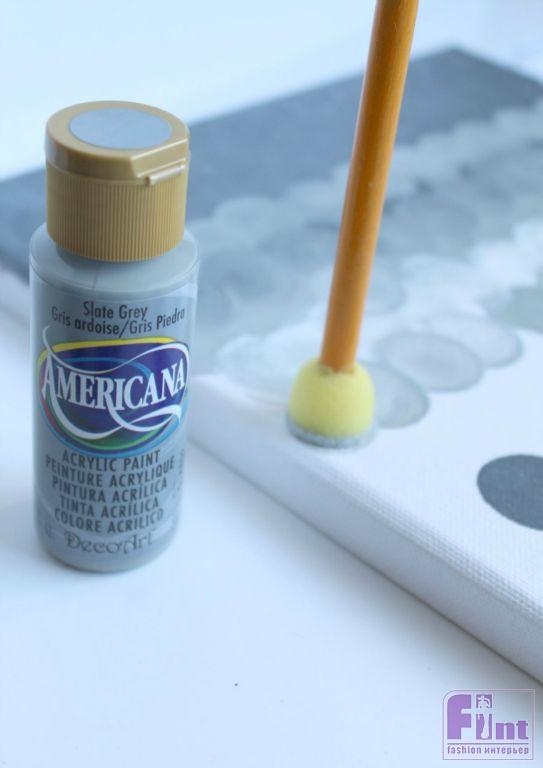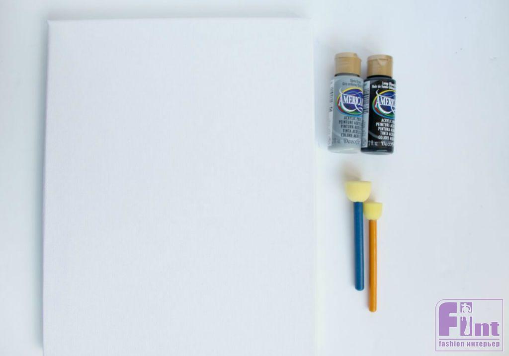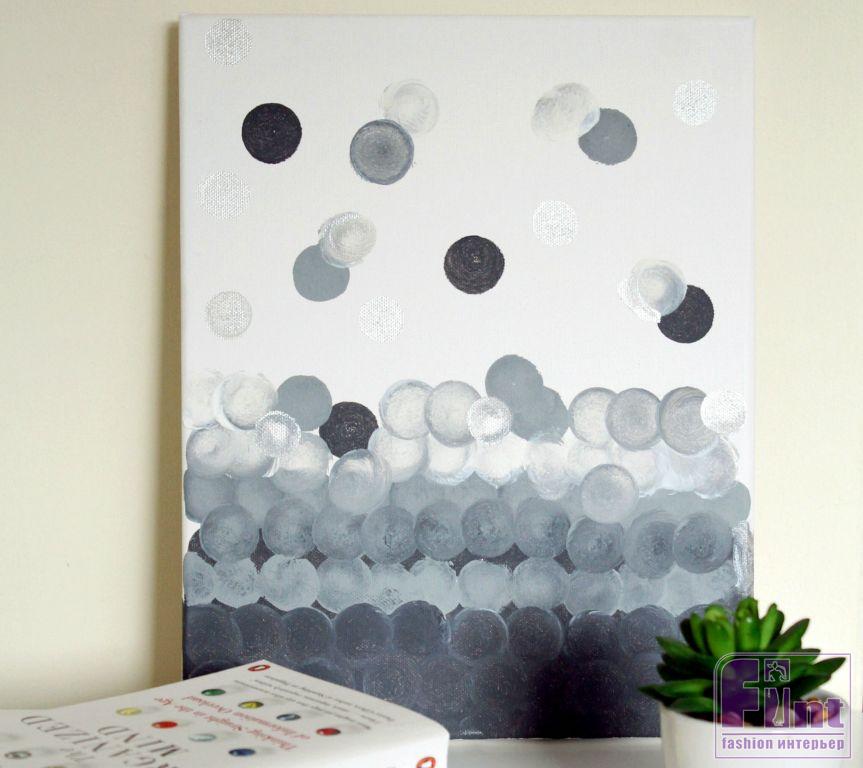 Чтобы изготовить такую абстрактную картину вас потребуется совсем немного: обычный холст на подрамнике подходящего размера (приобретается в любом магазине товаров для художников), акриловая краска светло-серого и тёмно-серого, почти чёрного оттенка, акриловая «серебряная» краска, круглые штампы из поролона двух размеров.