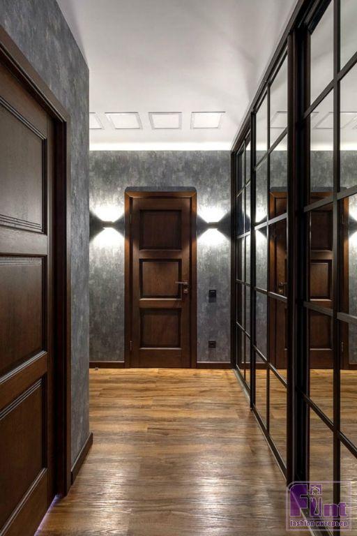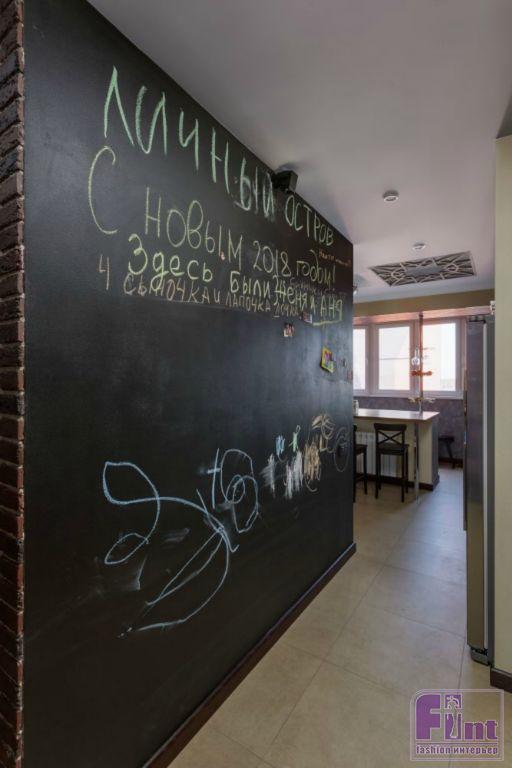 «Мы остановились на восточных и лофтовых элементах, так как семье эти стили нравятся больше всего, — поясняет Елена. — Однако мы по-разному смиксовали их в комнатах, чтобы получившаяся эклектика смотрелась гармонично». Так, стены прихожей украшает чёрное магнитно-меловое покрытие и имитация текстуры цемента. Именно заказчики захотели, чтобы одна из стен в прихожей была выкрашена магнитно-меловой краской, чтобы гости оставляли пожелания, а дети без вреда для стен реализовывали свои творческие замыслы.